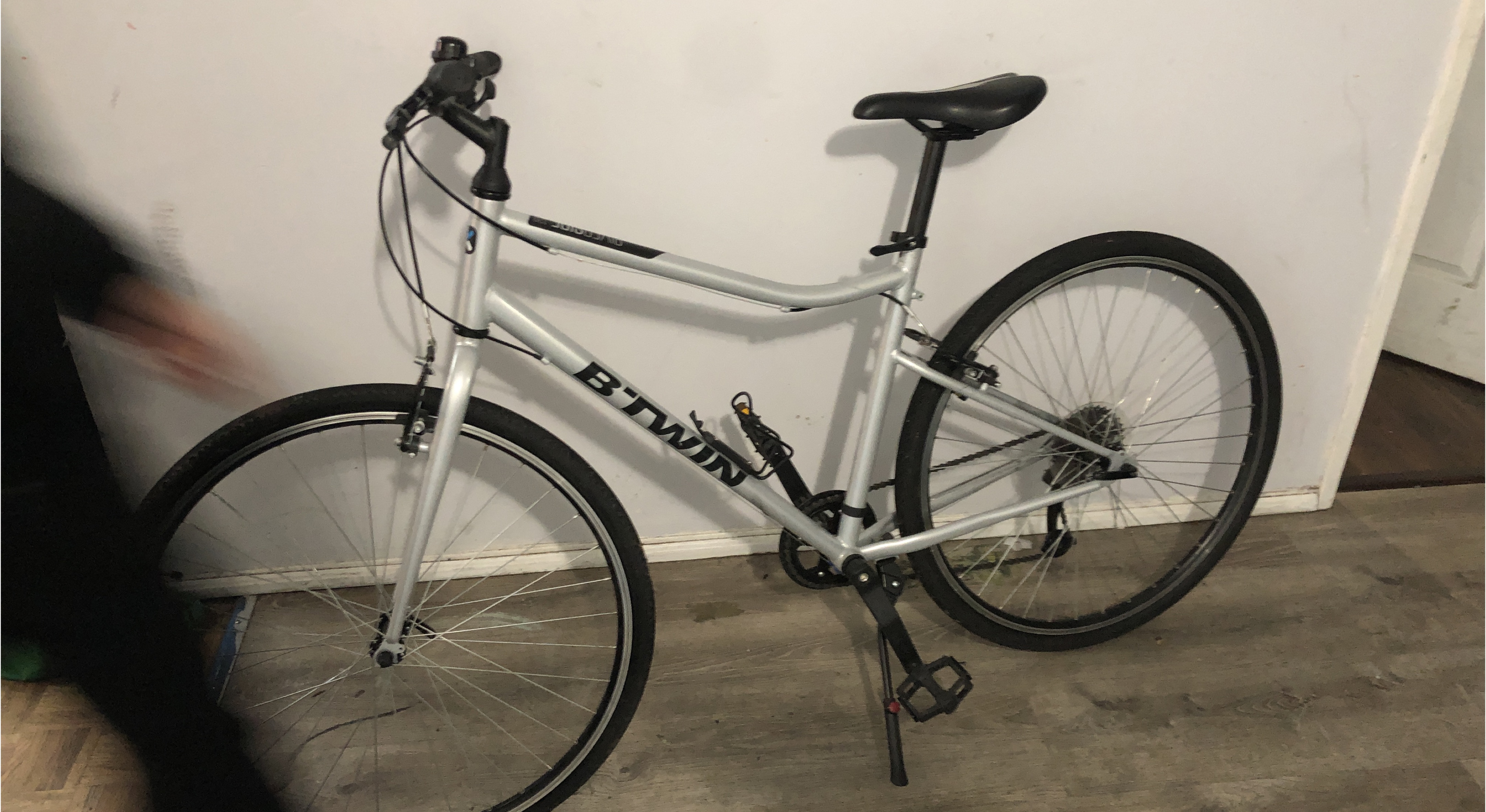 Selling a used BTWIN Riverside hybrid bike in silver. It's in good condition and ready for your next ride around town or on the trails. Perfect for commuting or leisurely weekend adventures!