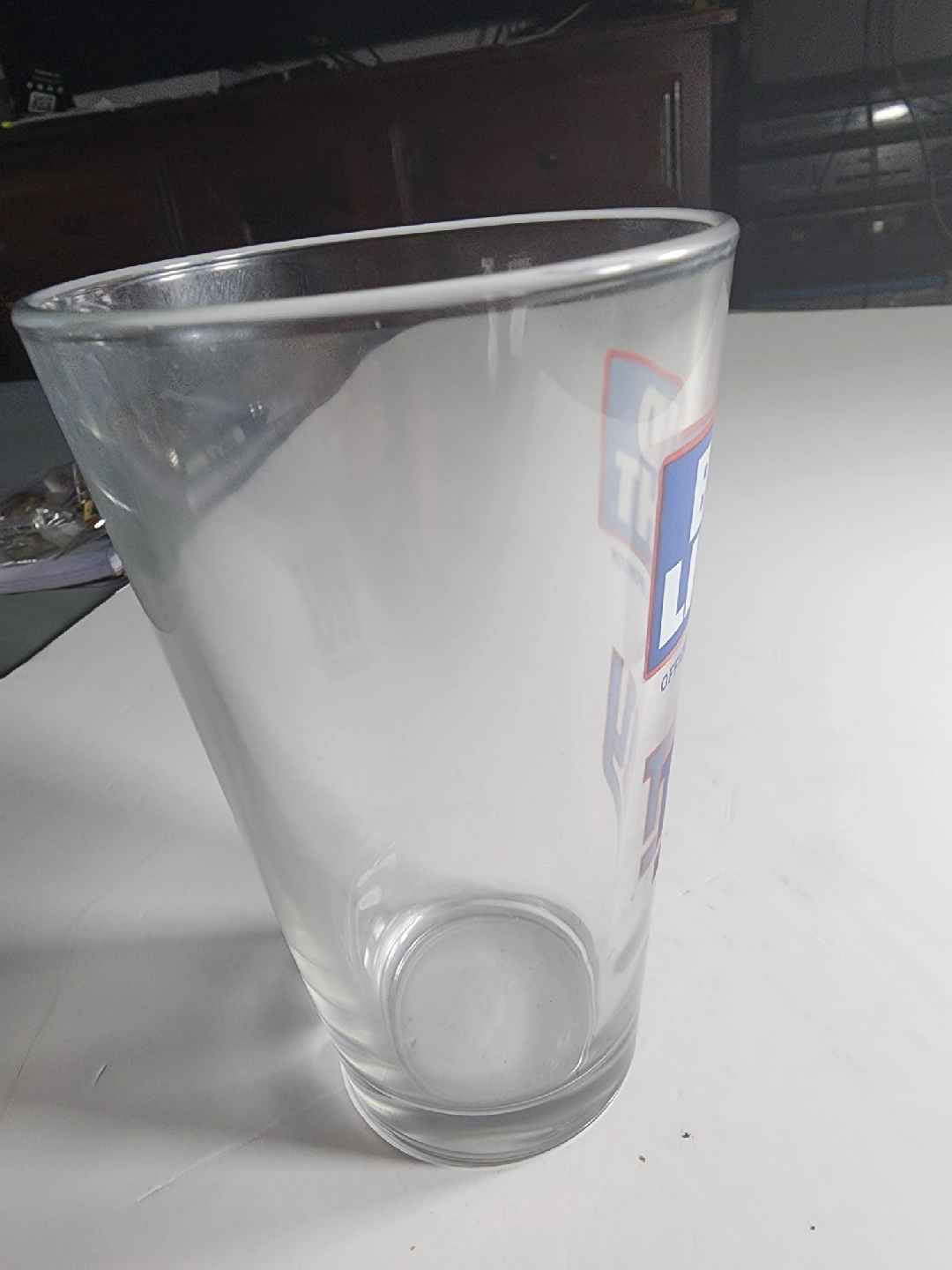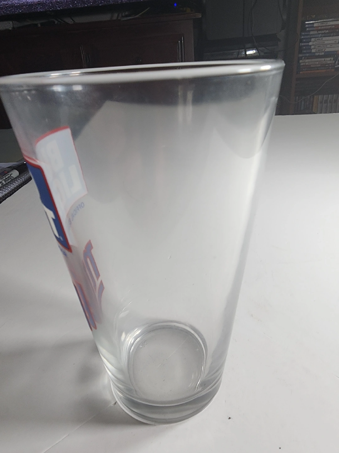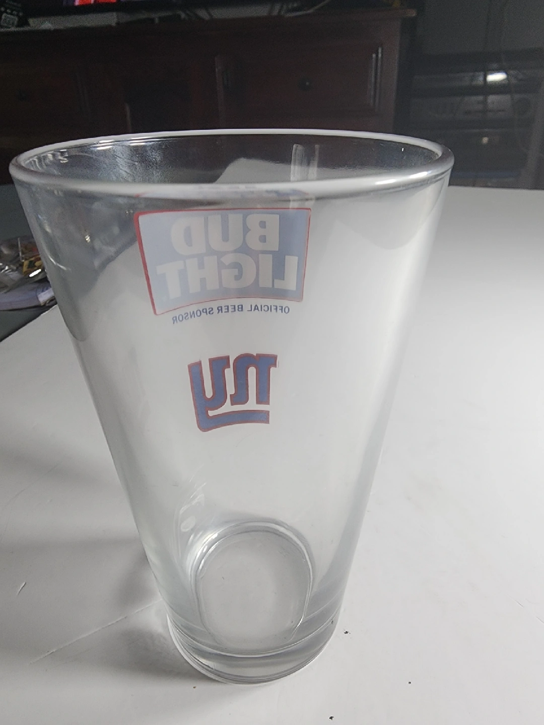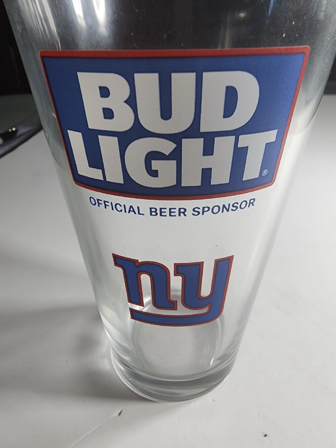 Selling a Bud Light pint glass featuring the NY Giants logo. Perfect for enjoying your favourite beverage while supporting your team!