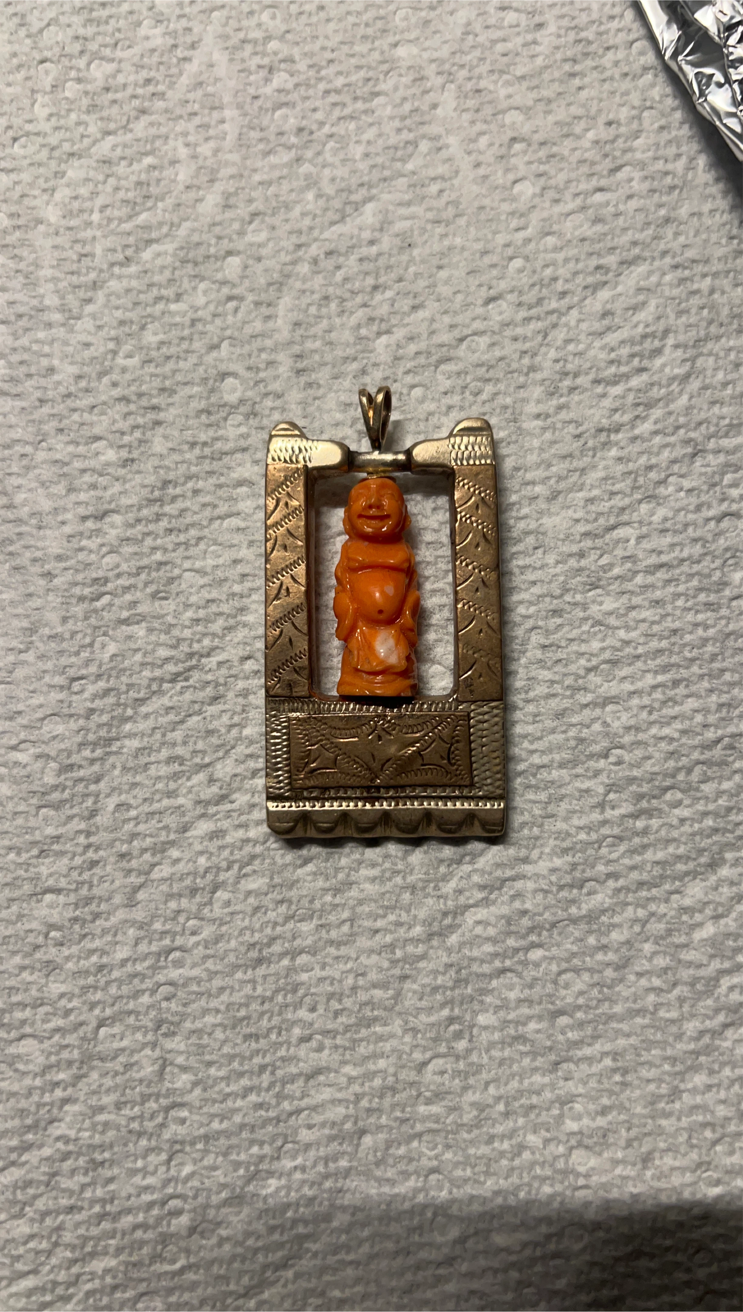 A unique Buddha pendant featuring a small orange Buddha figure set within a decorative gold-tone frame. Perfect for adding a touch of spirituality and style to any outfit