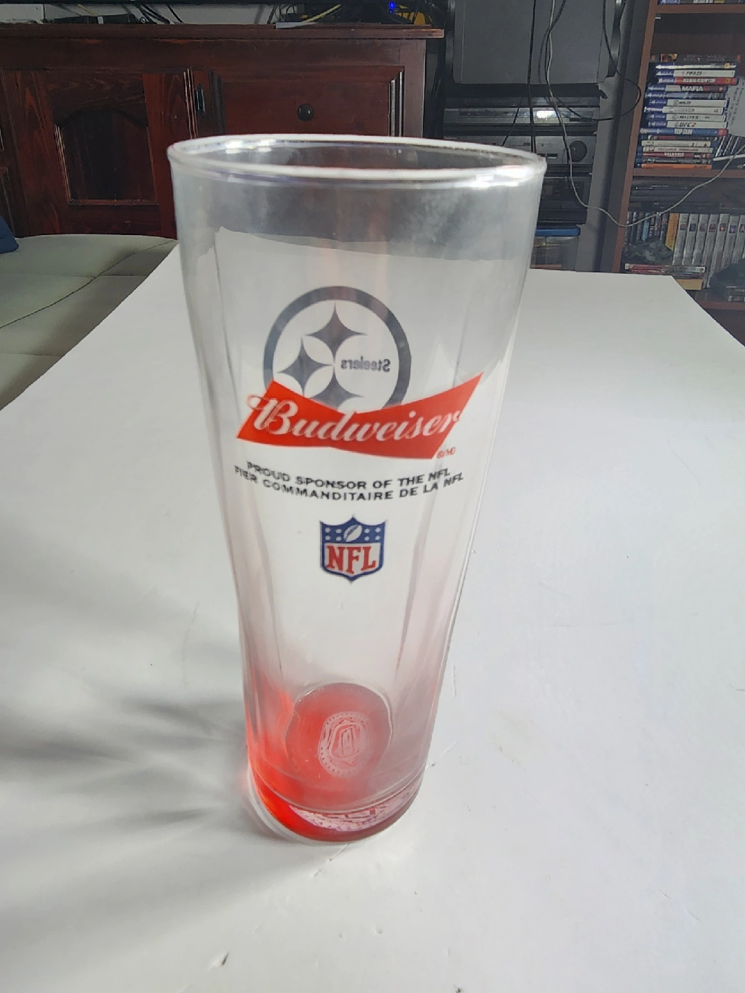 Selling a Budweiser pint glass featuring the Pittsburgh Steelers and the NFL logo. It's in great shape and perfect for any football fan!