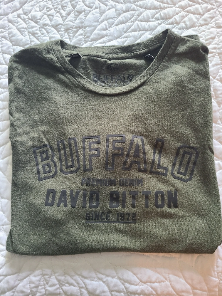 Selling a Buffalo David Bitton T-shirt in olive green. It's in great shape and features the brand's name prominently on the front. This premium denim tee has a classic look, perfect for casual wear