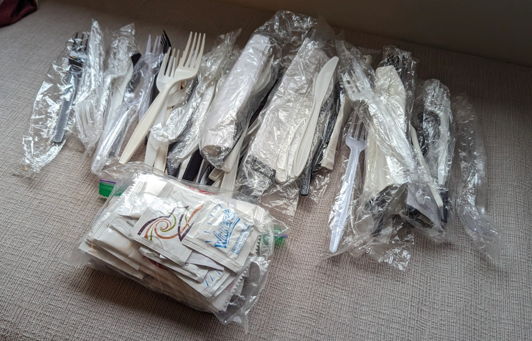 Selling a large assortment of individually wrapped plastic cutlery, including forks, knives, and spoons, in various colours like white, black, and silver. Perfect for parties, picnics, or stocking up!