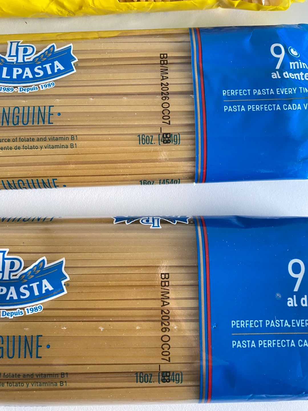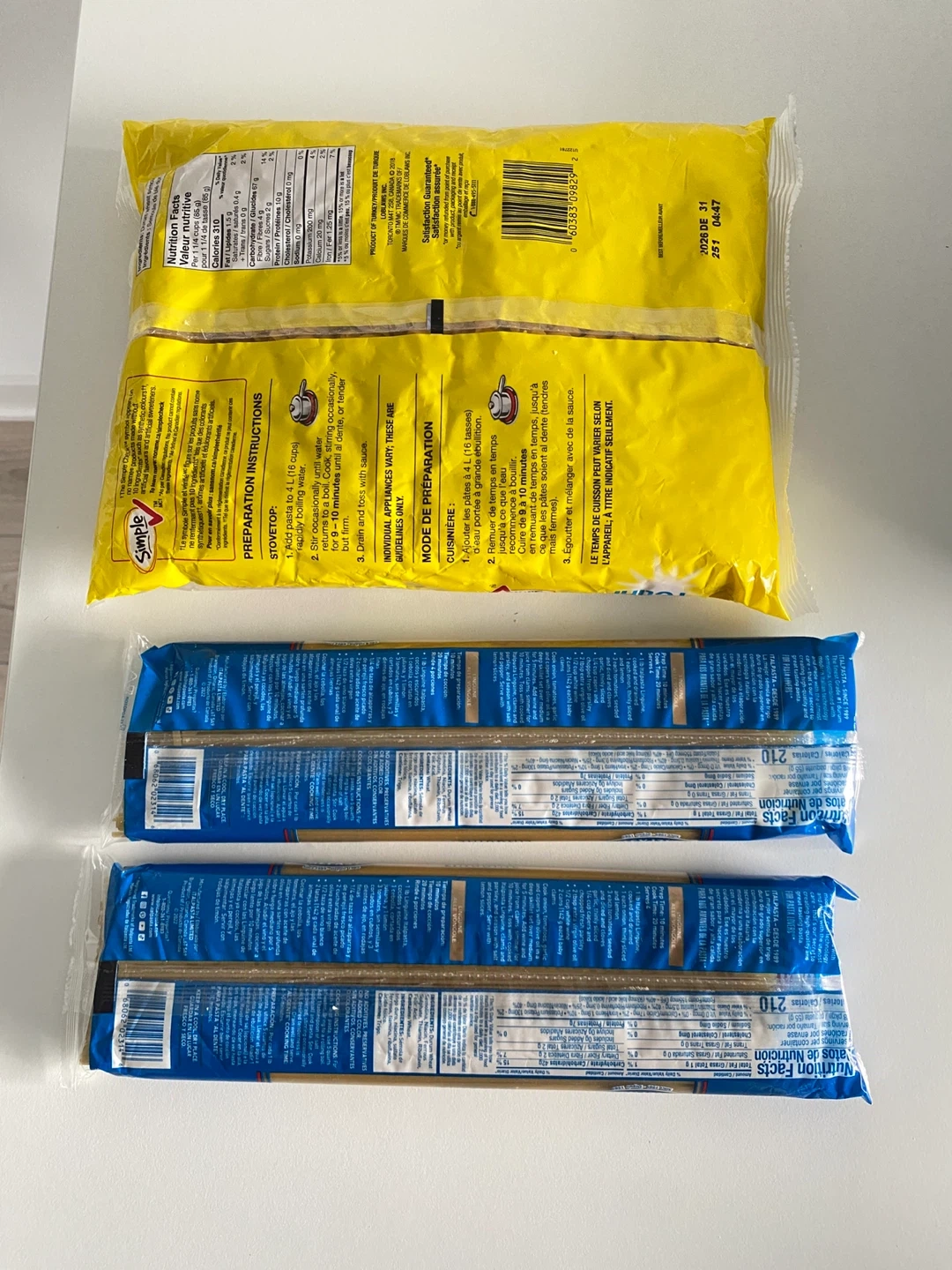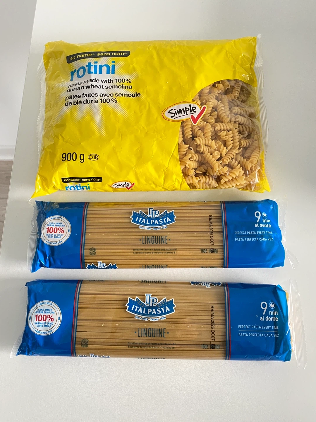 I have two packs of ItalPasta Linguine 908 grams (Expiry date - Oct 7, 2026) and one big bag of Simple Rotini pasta 900 grams (Expiry date - Dec 31, 2026)