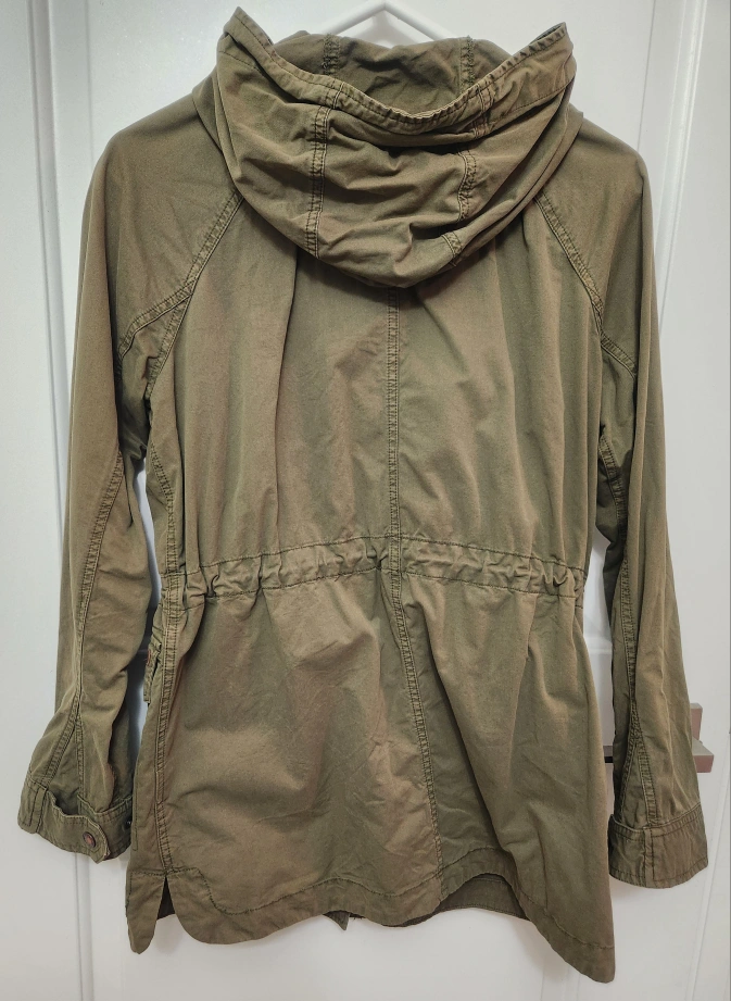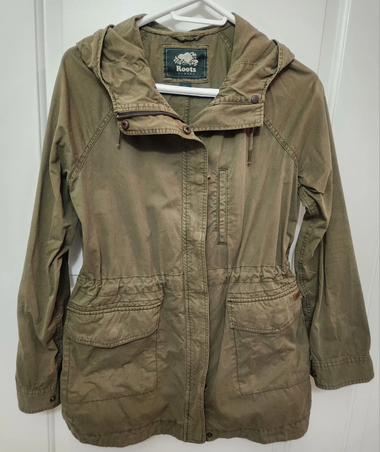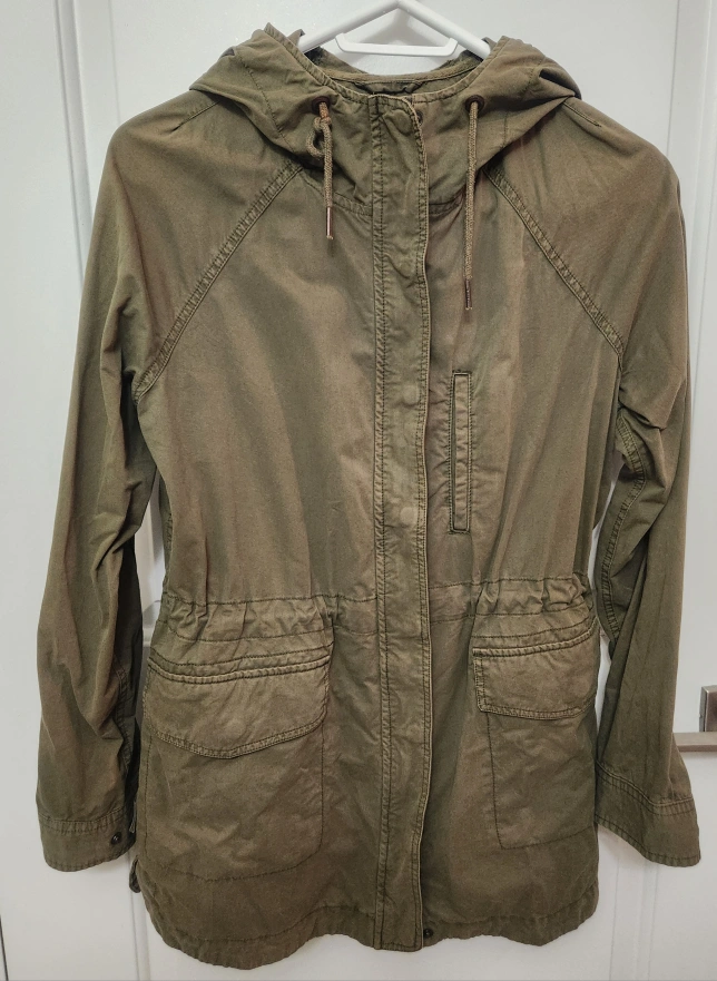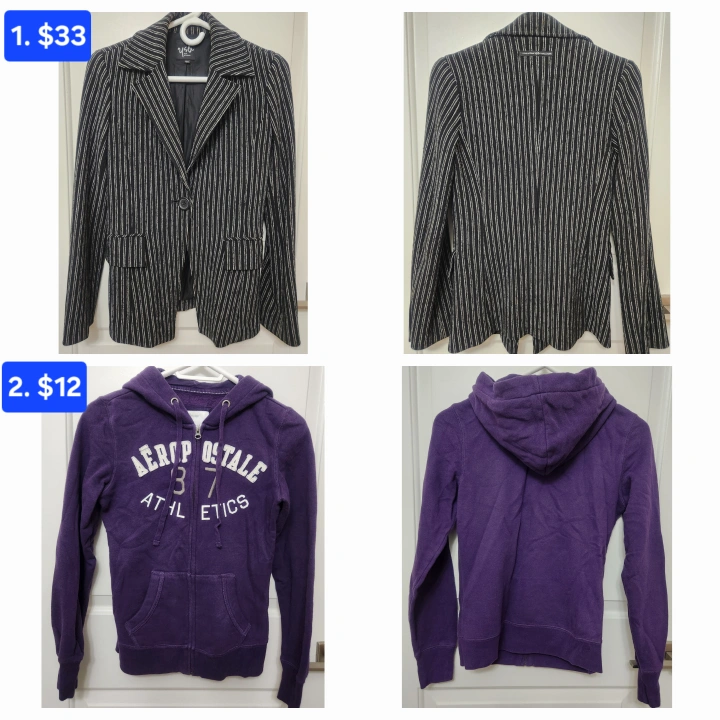 1. Khaki colour jacket with a hood. Has three pockets. Adjustable waist with a string. (small/ $30) The jacket is a relaxed fit. You can slip it on during a cool day while enjoying a nice walk. *There's some discoloration around a zipper and a button, but barely can't see them. Please see the pics. Because of this, I'm offering it at a discounted price. 2. a black and white striped blazer(small/$33) 3. a purple zip-up hoodie (small/$12) πyou can buy them separately Bundle $55 condition: good pet free and smoke-free home fixed price (CASH only) final sale pick up ONLY in front of TCDSB It is available if you see the post with no indication of "reserved." Please do not ask. Msg me when you want it only. π