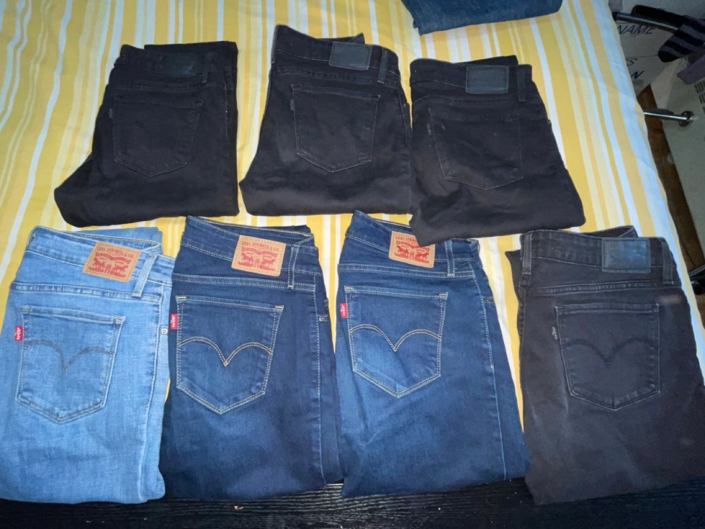 Eight pairs of women's Levi's jeans. Assorted colours and washes. Great condition 7 size 27s 1 pair of size 28s Levi’s 711 skinny jeans $25 each