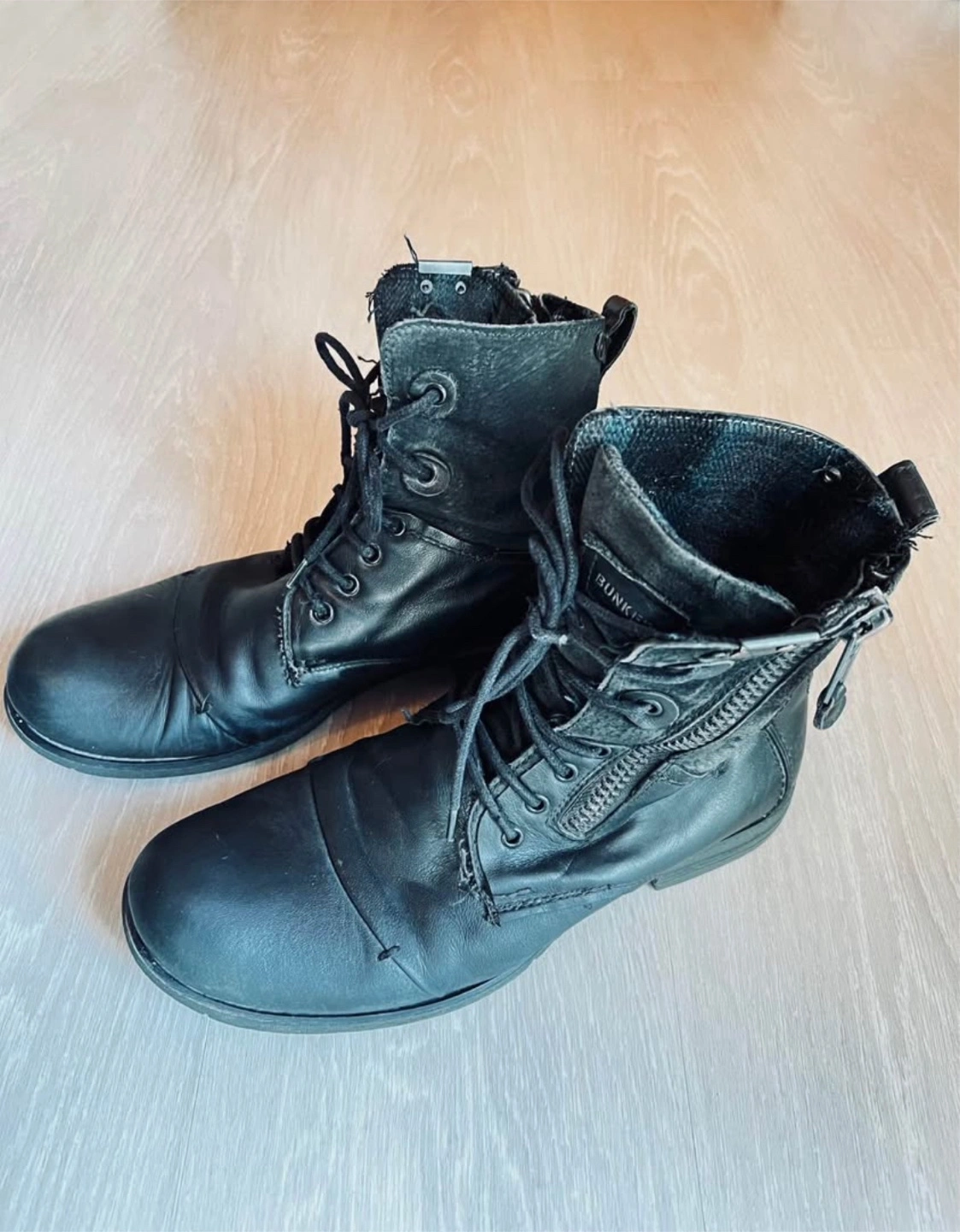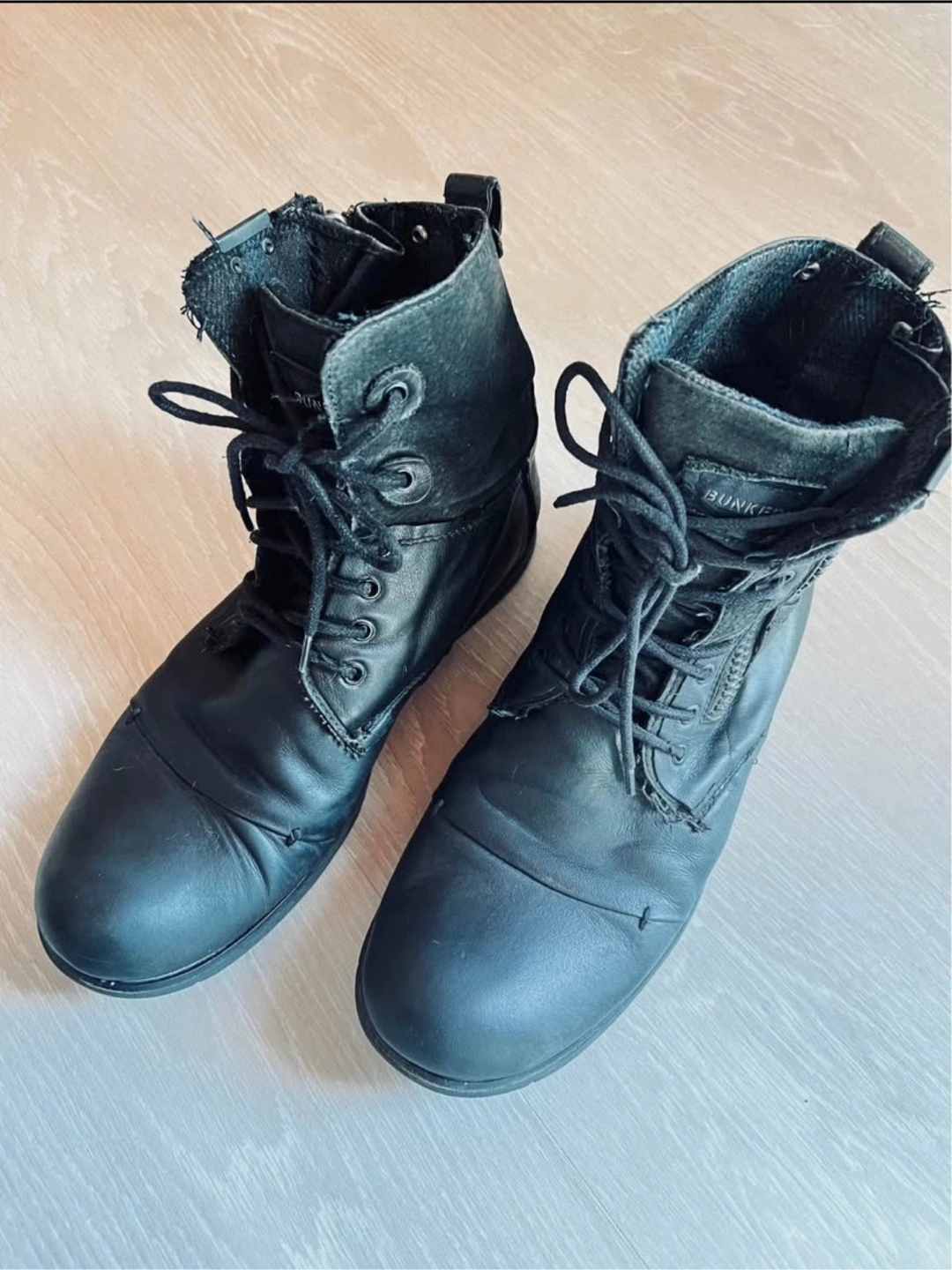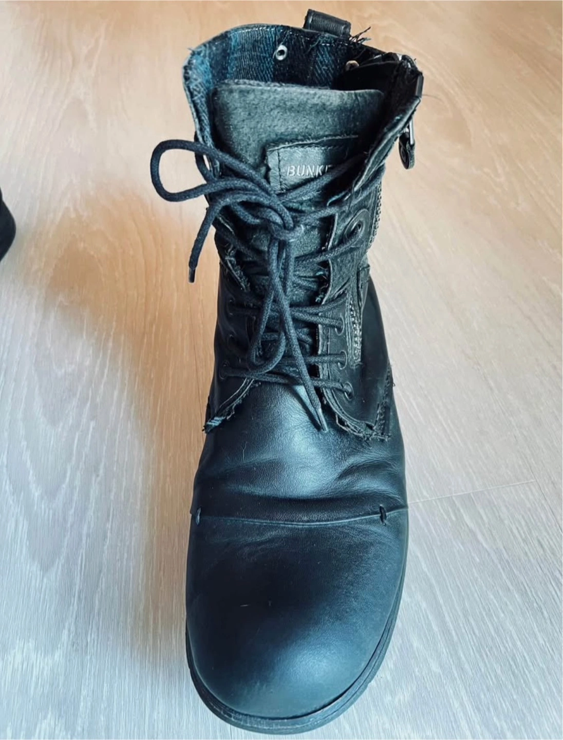 Stylish | Rugged | Rare Find Upgrade your footwear game with these hard-to-find Bunker combat boots – a sleek mix of distressed black leather and durable canvas, built to last with grippy rubber soles. - Men’s Size 8.5 (EUR 42) - Very Good Condition - High-quality materials, military-inspired style, and all-day comfort. Perfect for streetwear lovers, urban explorers, or anyone who appreciates standout footwear.