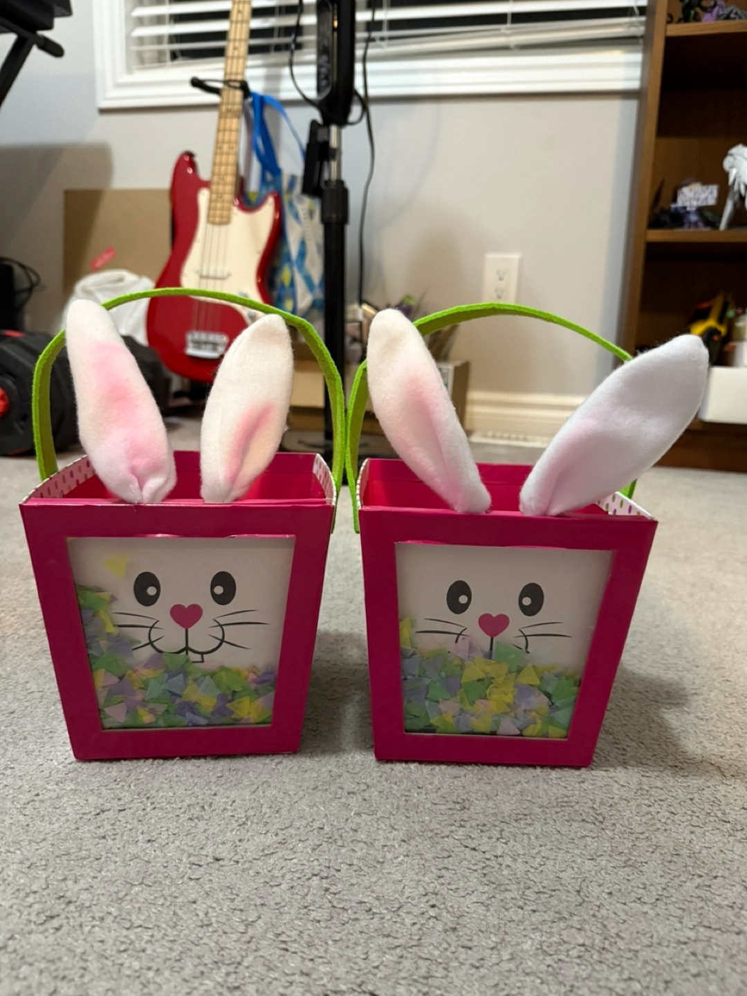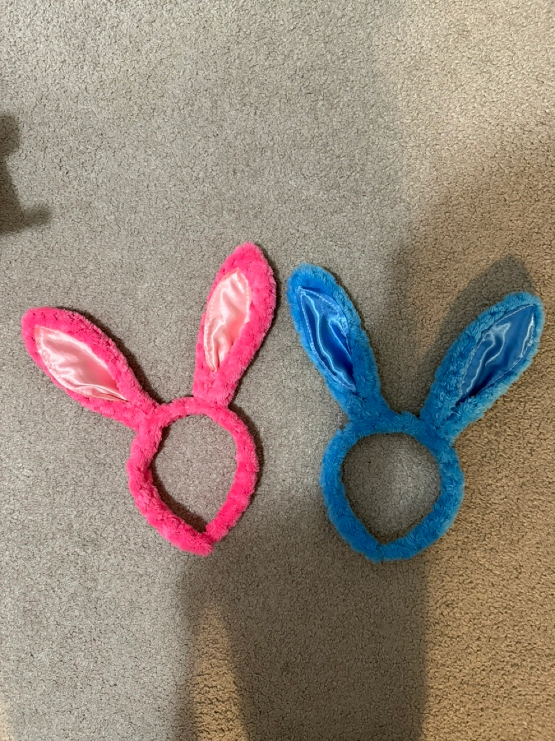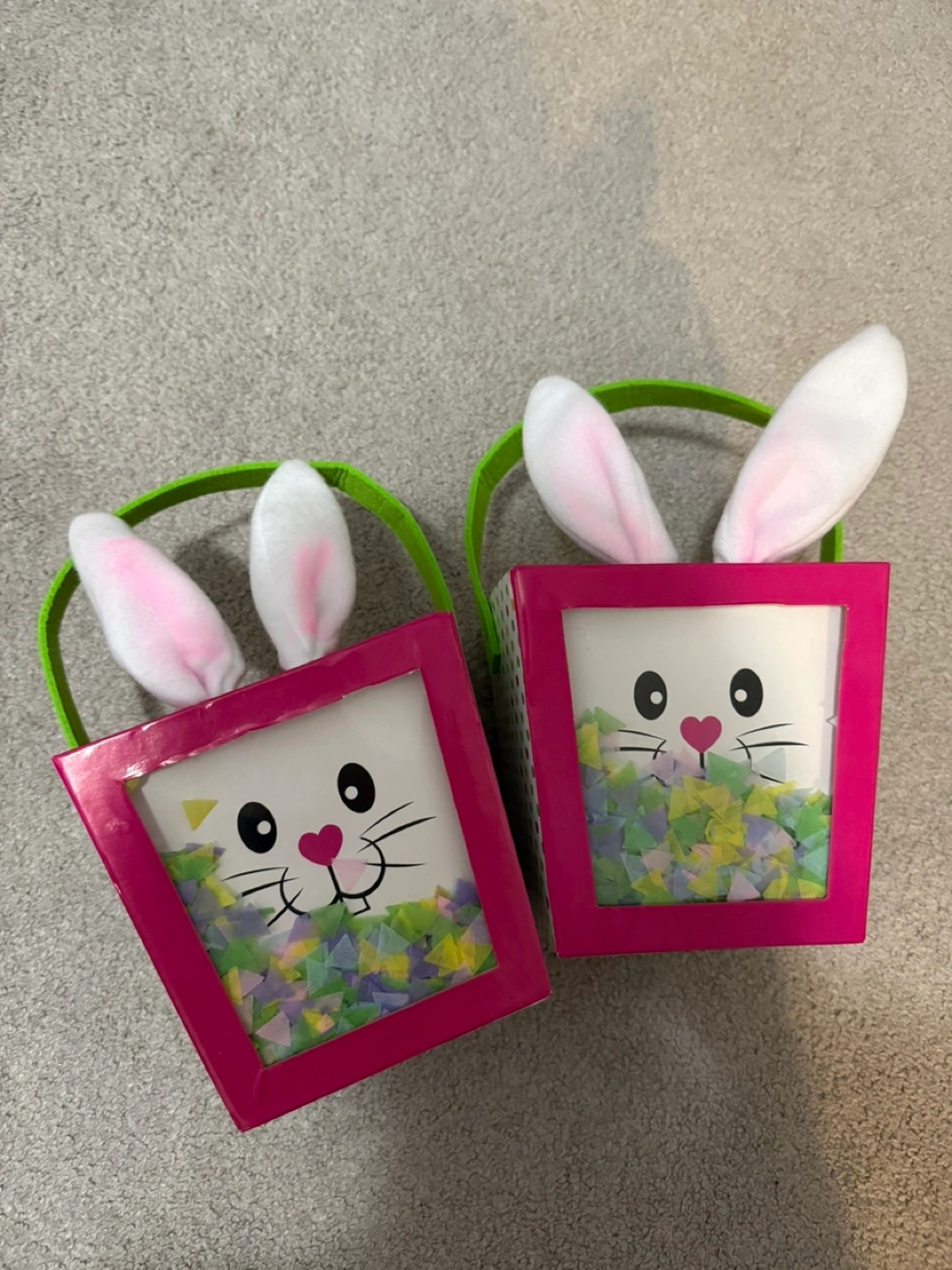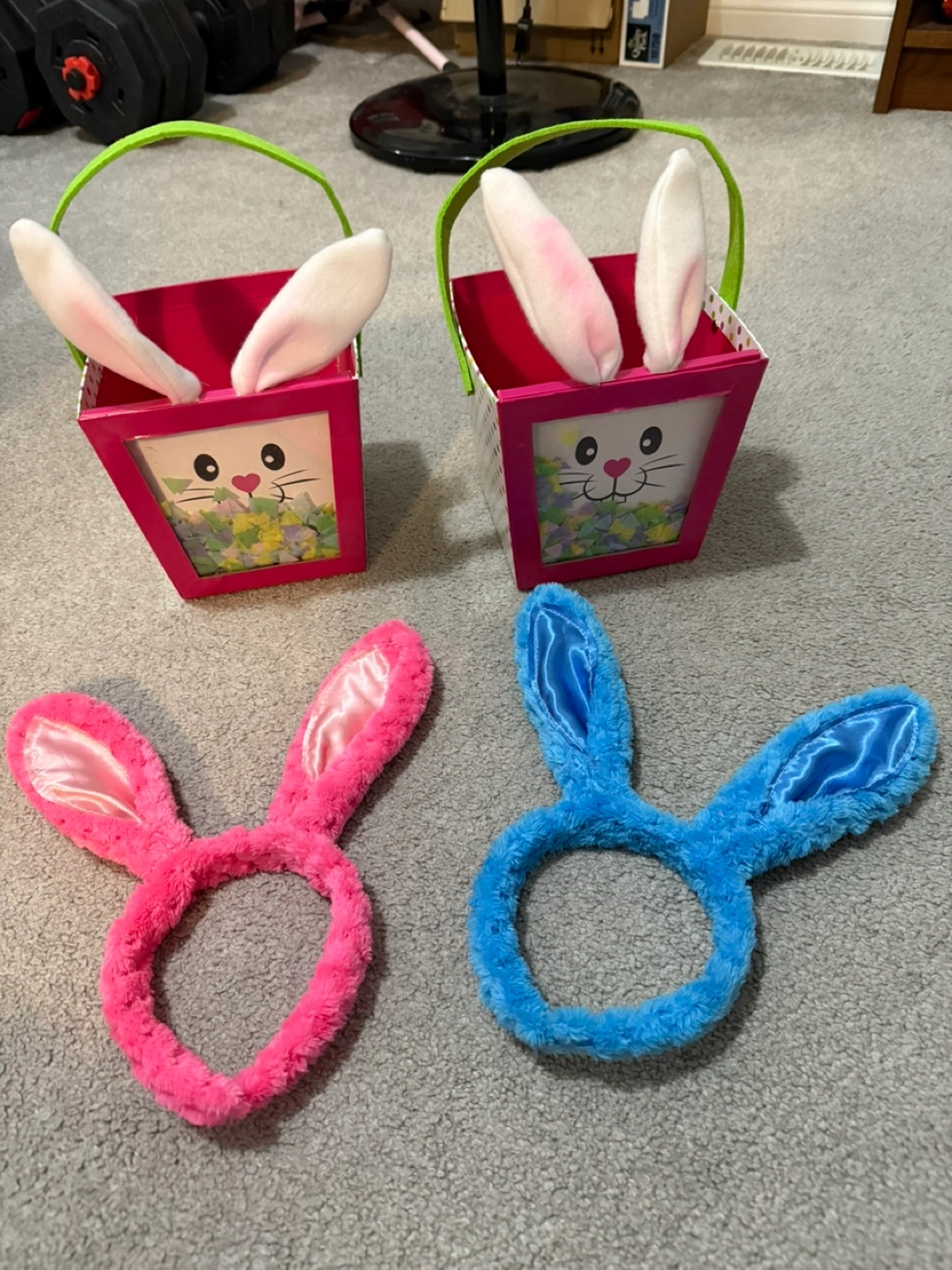 Bunny Easter baskets, with confetti, felt ears, and felt handles x2. Dimensions: 6 x 6 x 6 inches. Fluffy pink and blue bunny ear headbands! Ears are 6 inches long. All items used during our nephew/niece during Easter last year, but cleaned thoroughly. All items for 15$! Happy Easter!