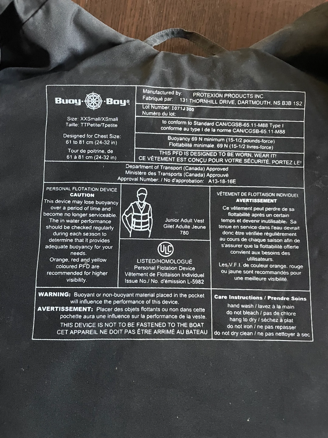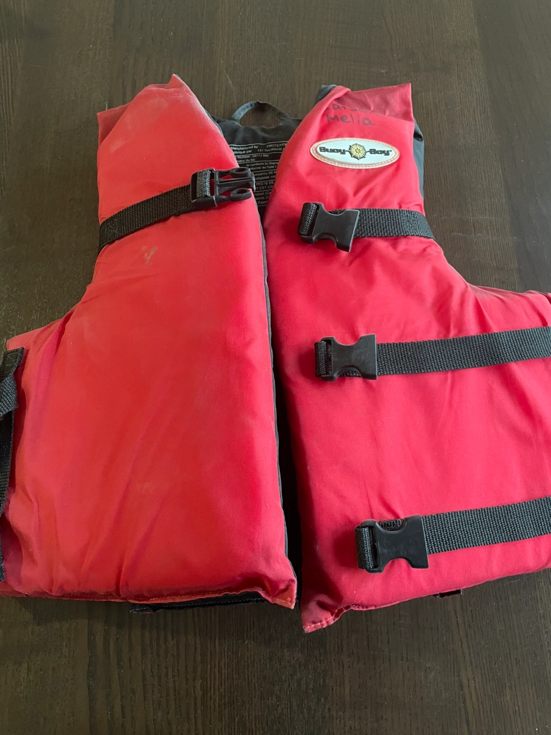 I'm selling a Buoy-Boy life jacket in size XXSmall/XSmall. It's designed for a chest size of 61 to 81 cm (24-32 in). The colours are red for higher visibility. This is a personal flotation device.
