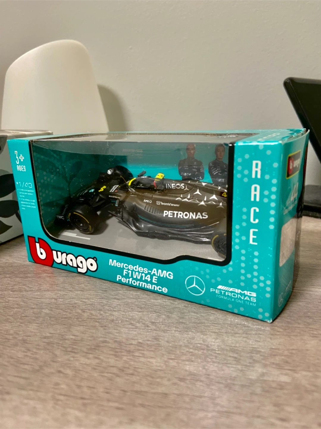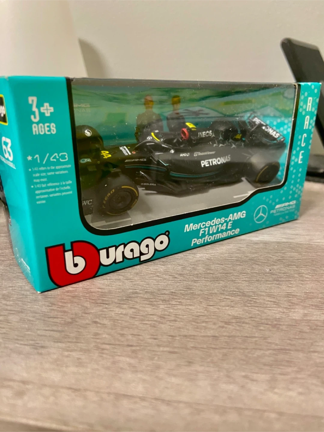 Selling a brand new Burago Mercedes-AMG F1 W14 E Performance die-cast model car. It's a 1/43 scale replica with high quality parts. The box is included!