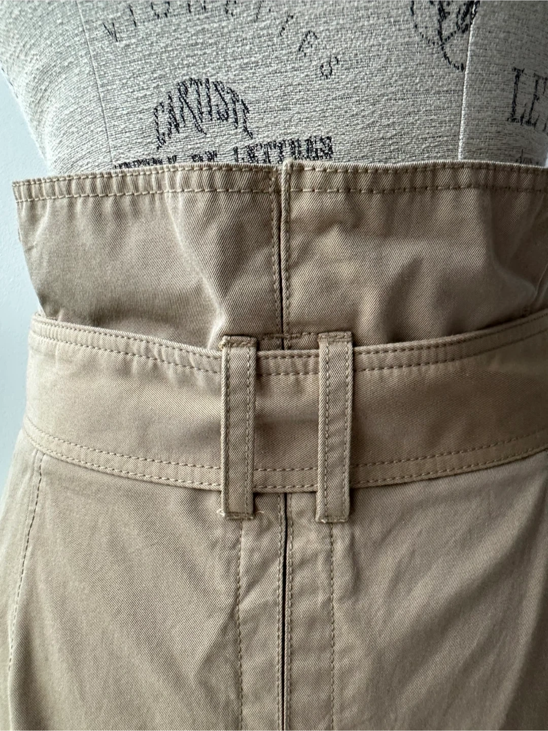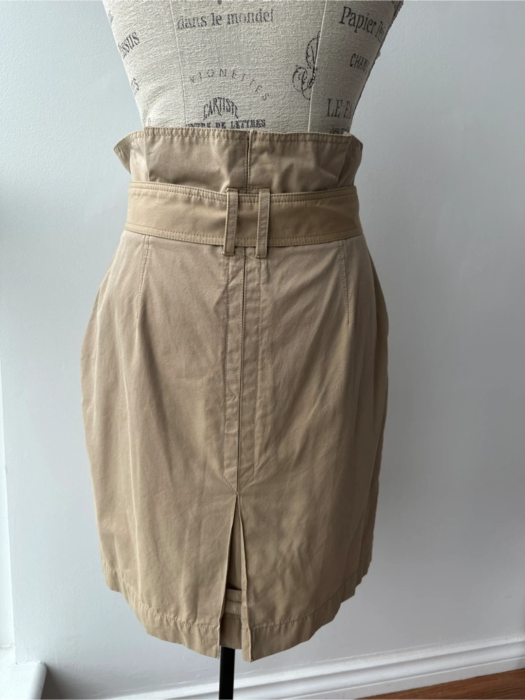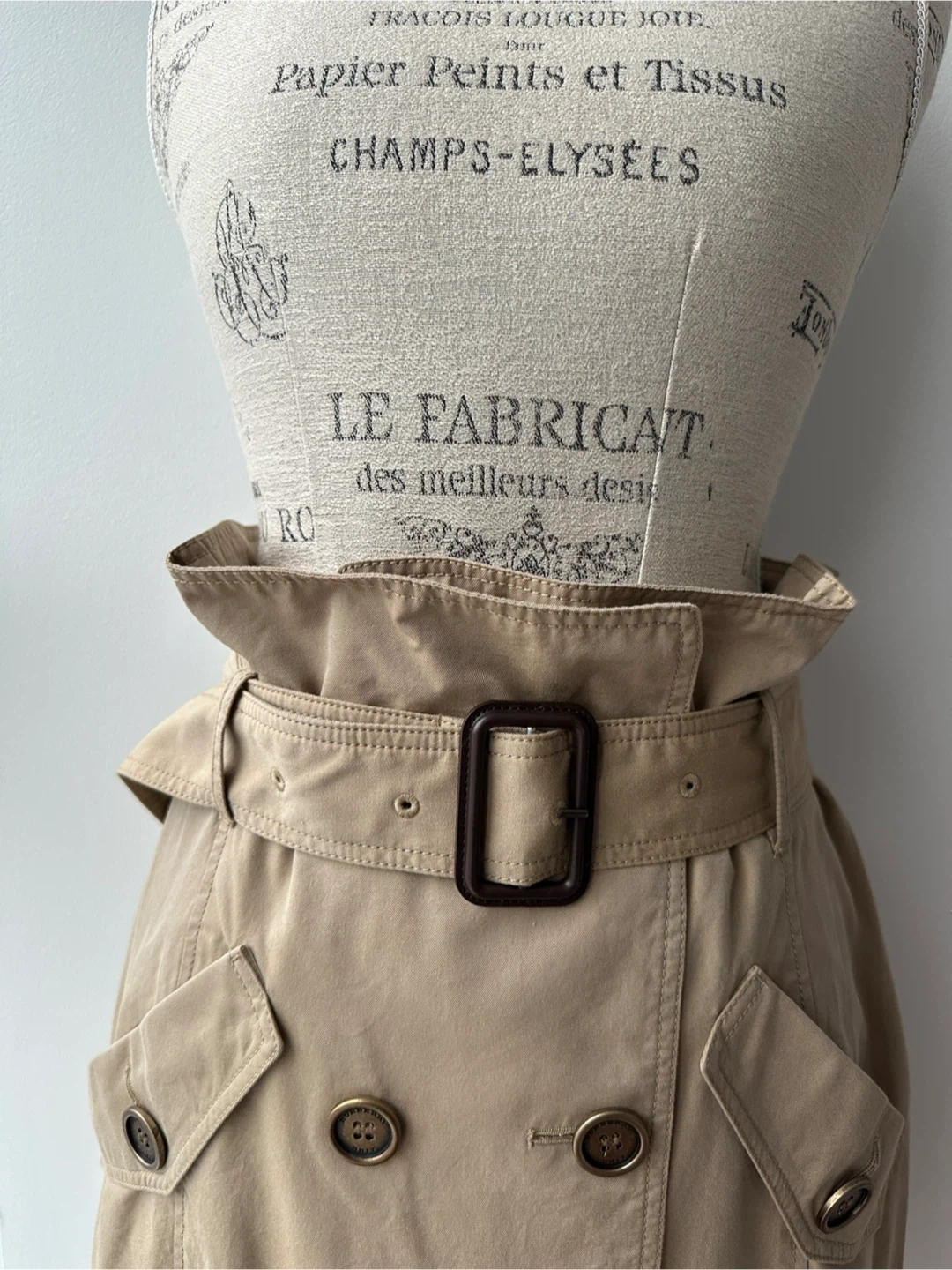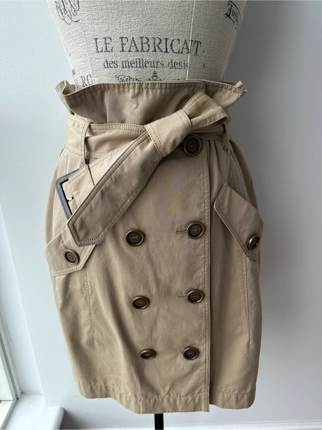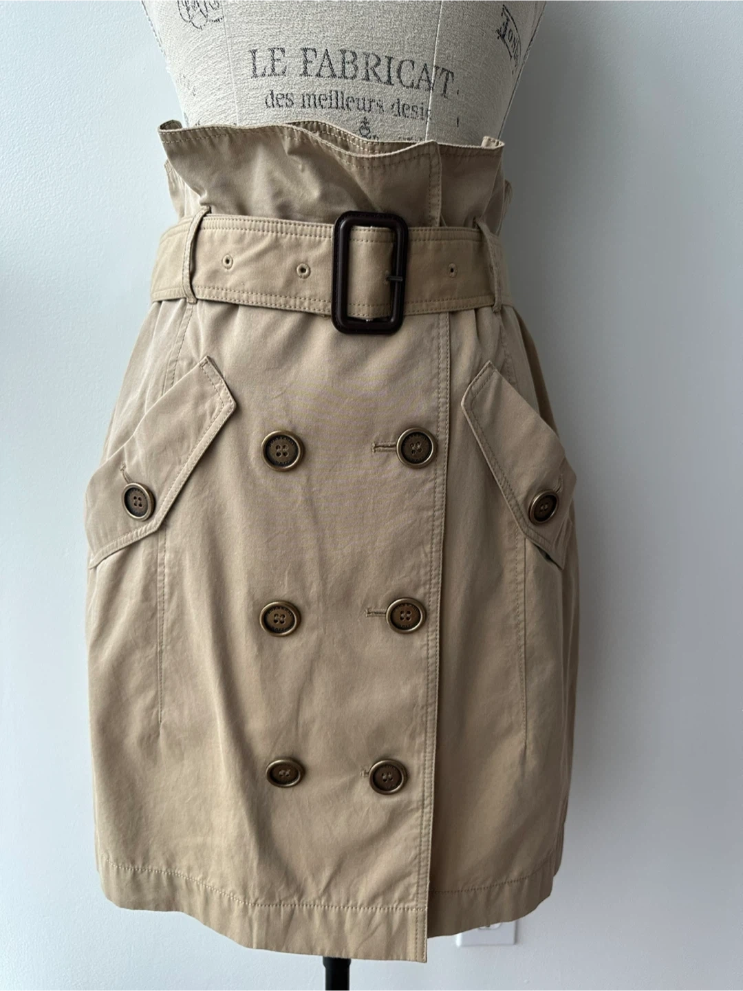 This Burberry skirt is inspired by the classic trench coat, as seen with the double button detail in the front. The paper bag waist adds character to any outfit and the belt cinches the waist nicely. It has a unique design with buttoned pockets, perfect for adding a touch of sophistication to your wardrobe! Length: ~ 21.5 inches Waist: ~ 16.5 inches