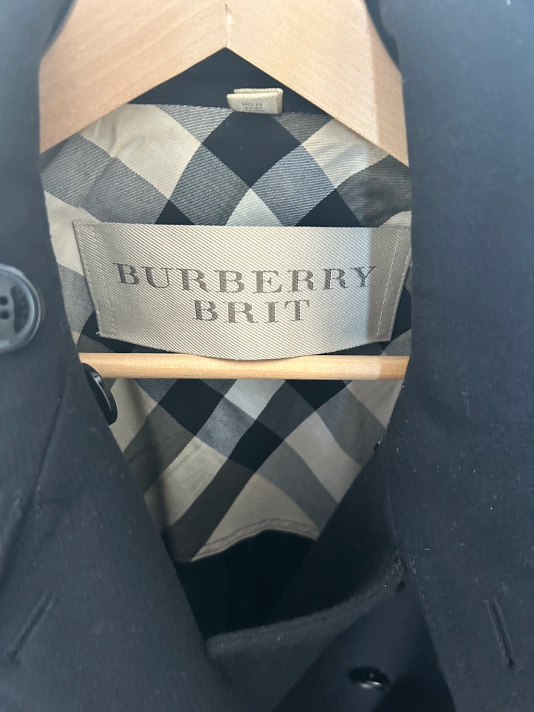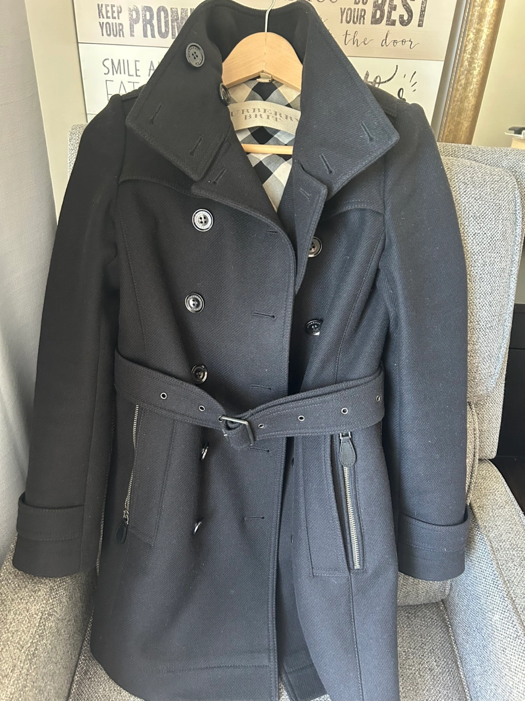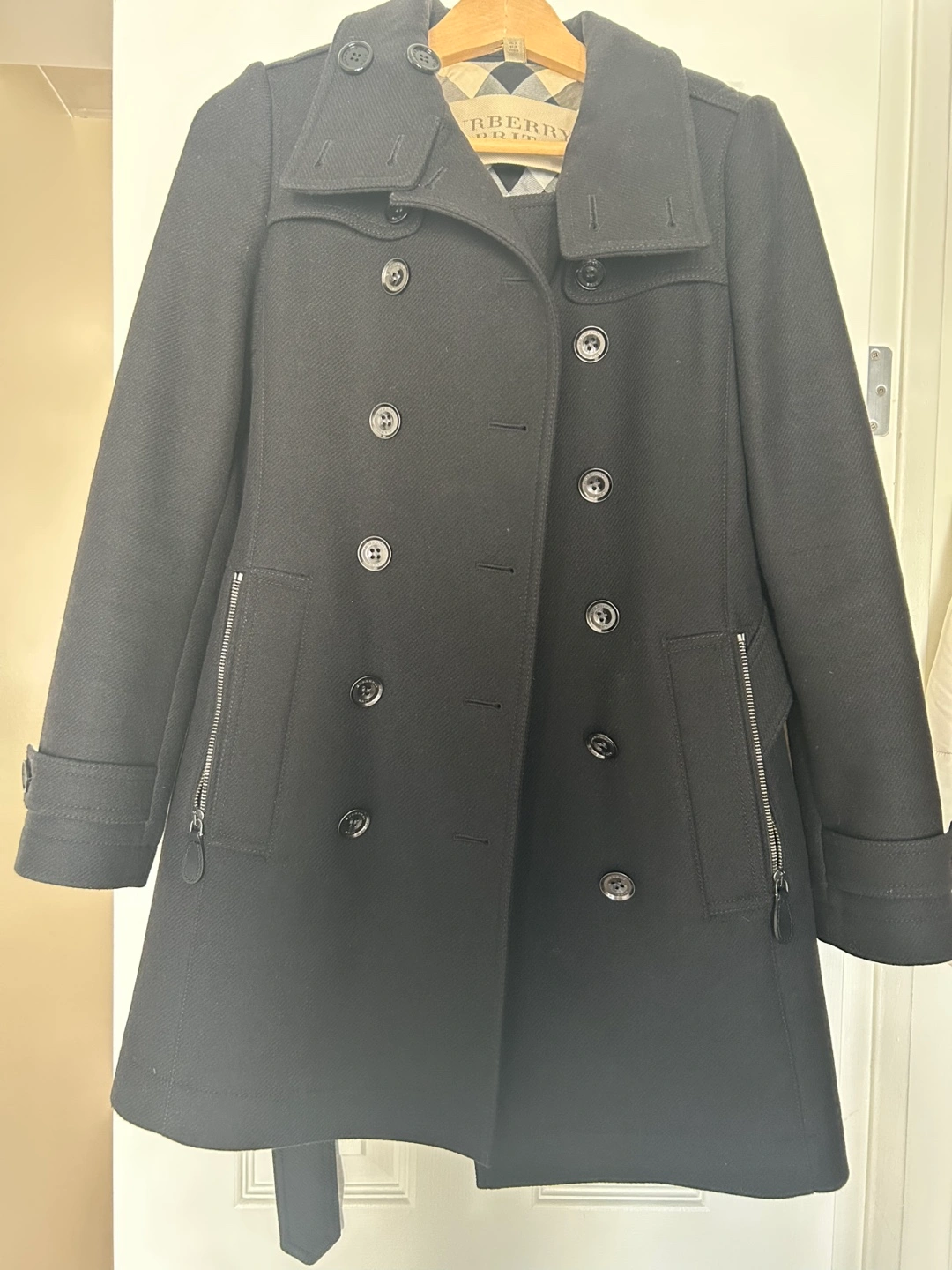 Women's black peacoat. Double breasted, belted. Zippered side pockets. Classic style.