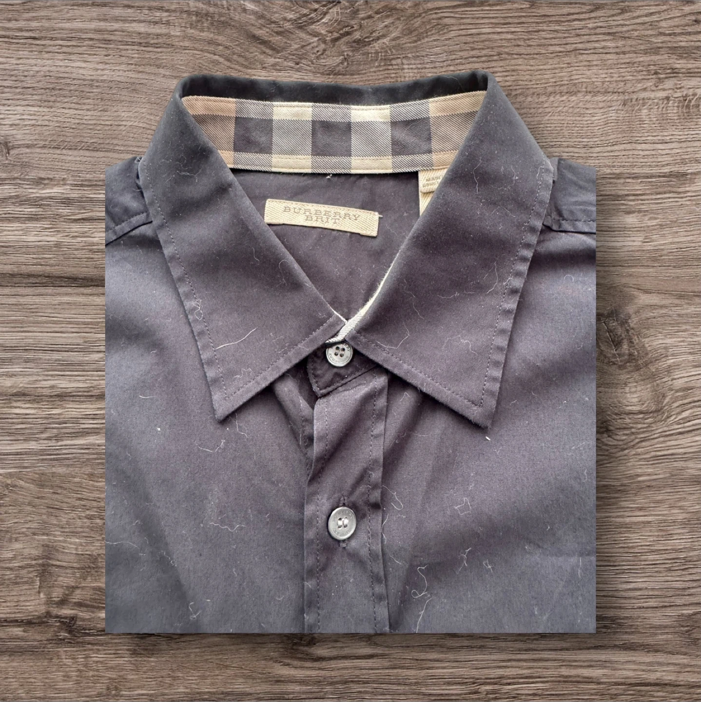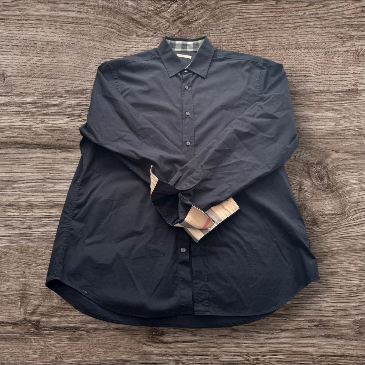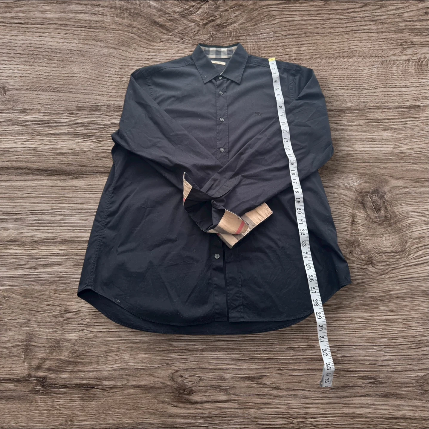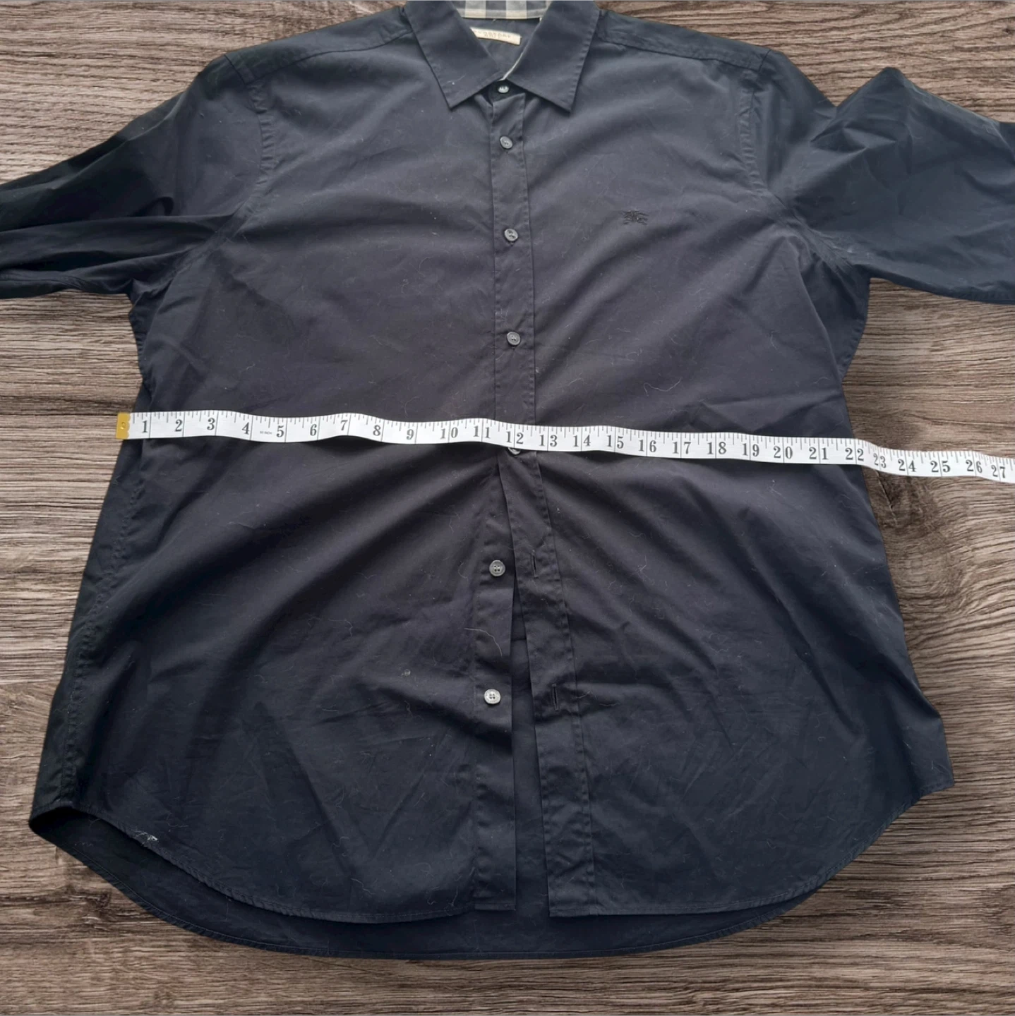 Selling a Burberry Brit black button-down shirt. It's in good condition and features the classic Burberry check pattern on the collar and cuffs. The shirt measures approximately 26 inches across the chest.