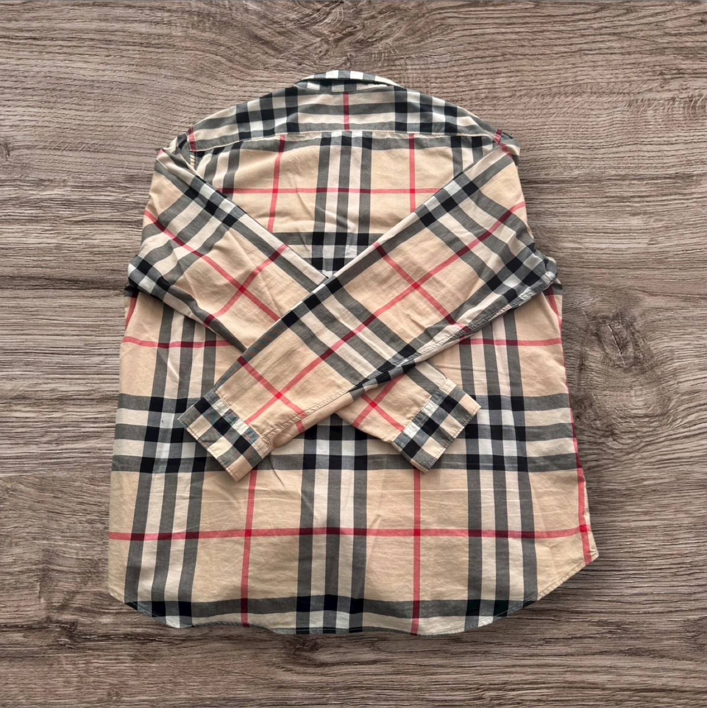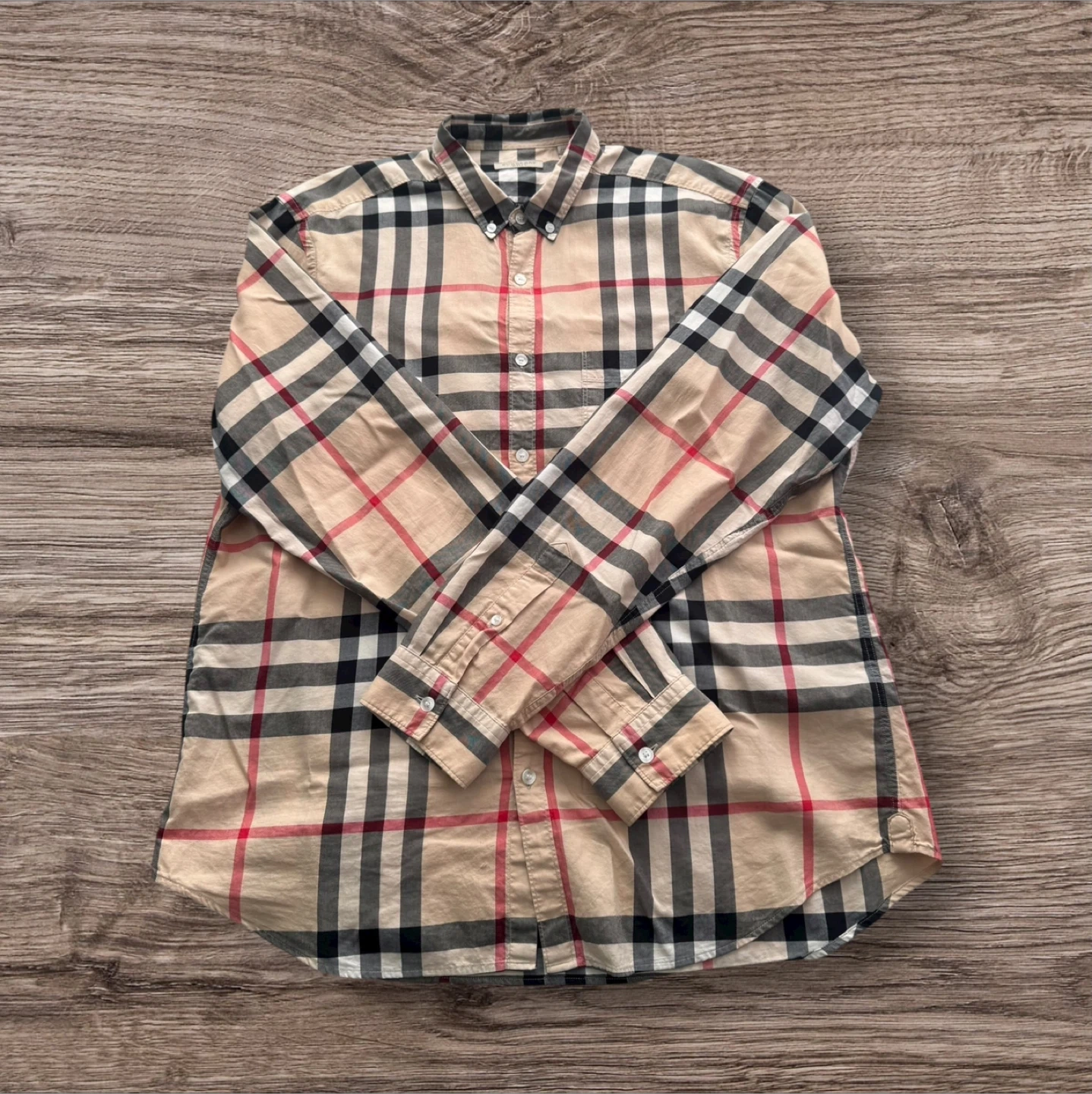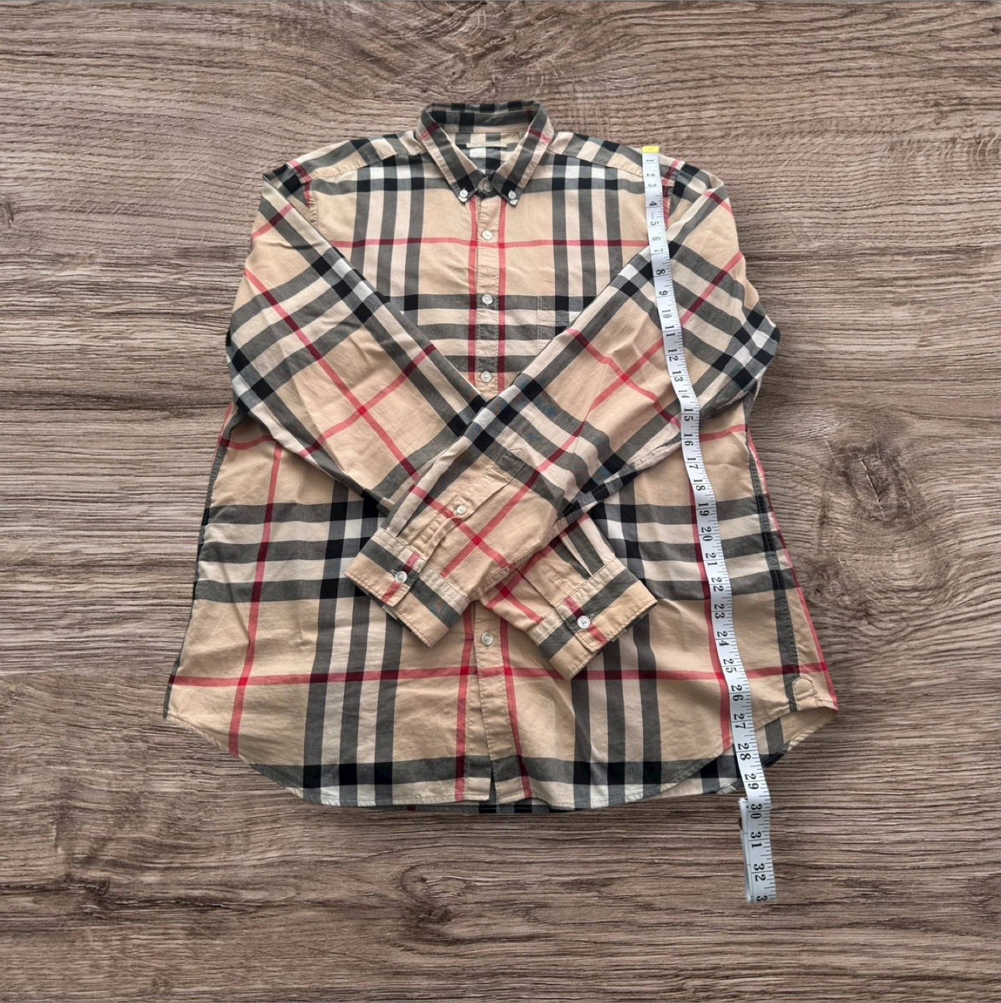 Selling a Burberry Brit button-down shirt in a classic plaid pattern. It's in good condition with some signs of wear. Perfect for adding a touch of British style to your wardrobe!