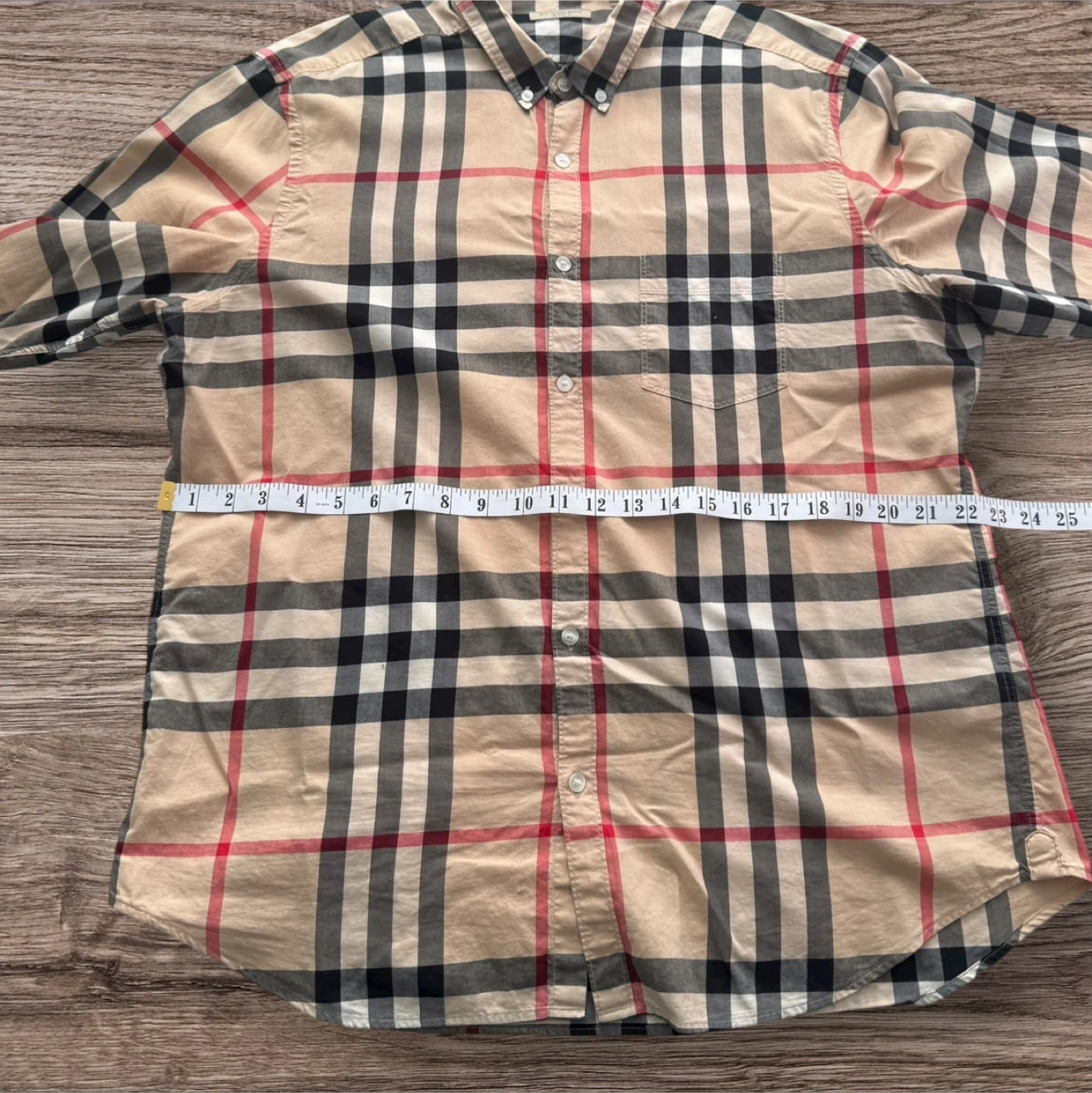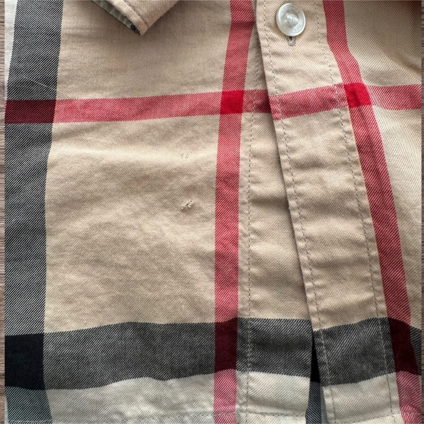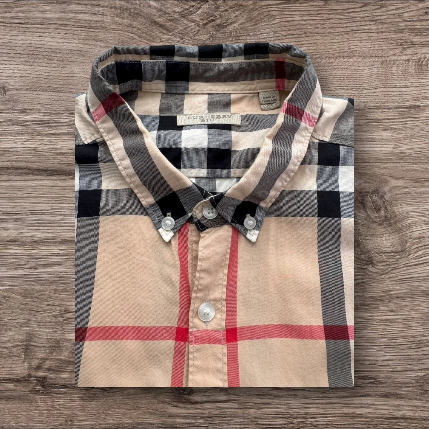 Selling a Burberry Brit button-down shirt in a classic plaid pattern. It's in good condition with some signs of wear. Perfect for adding a touch of British style to your wardrobe!