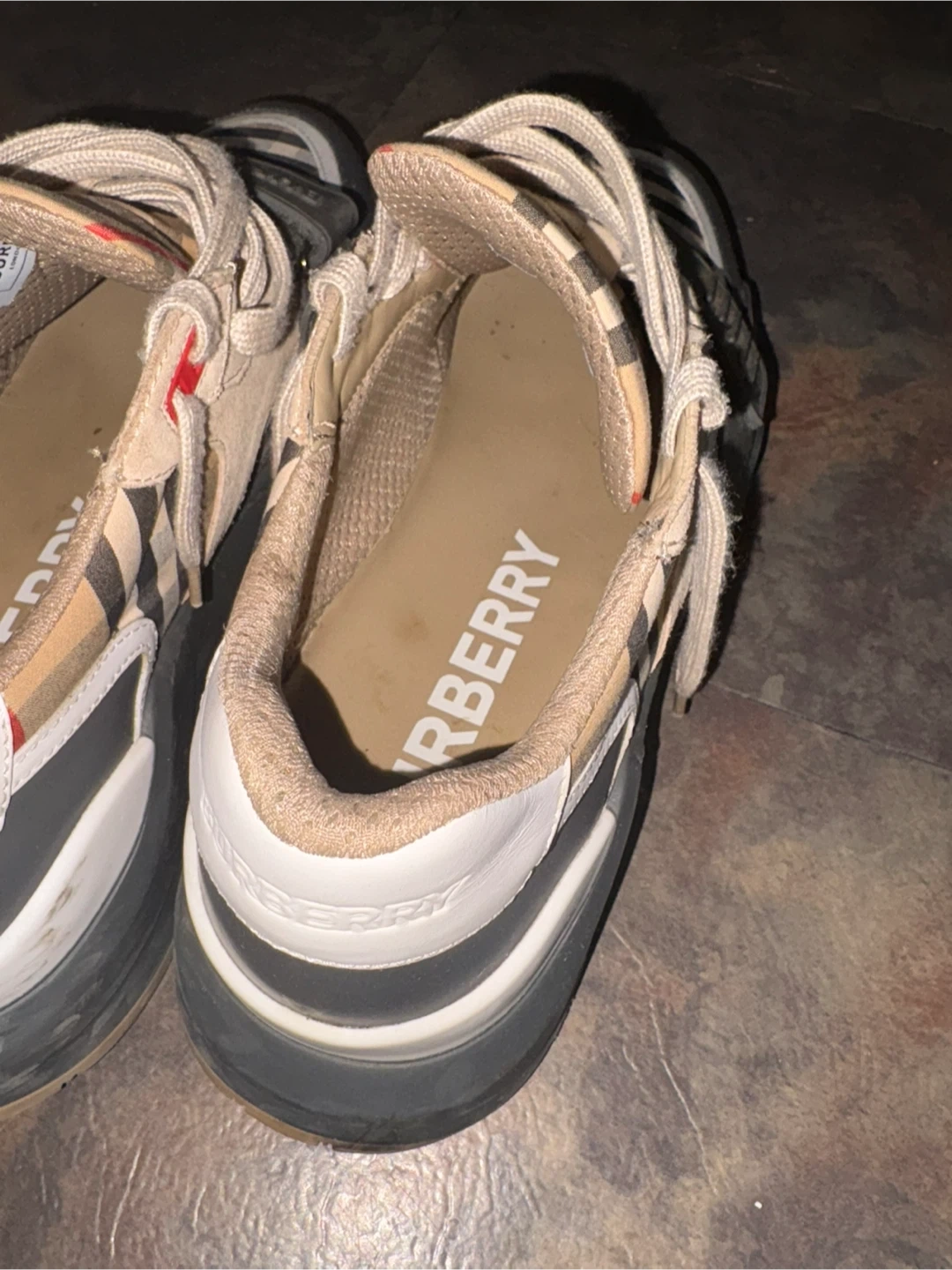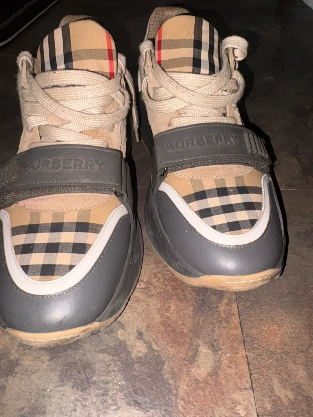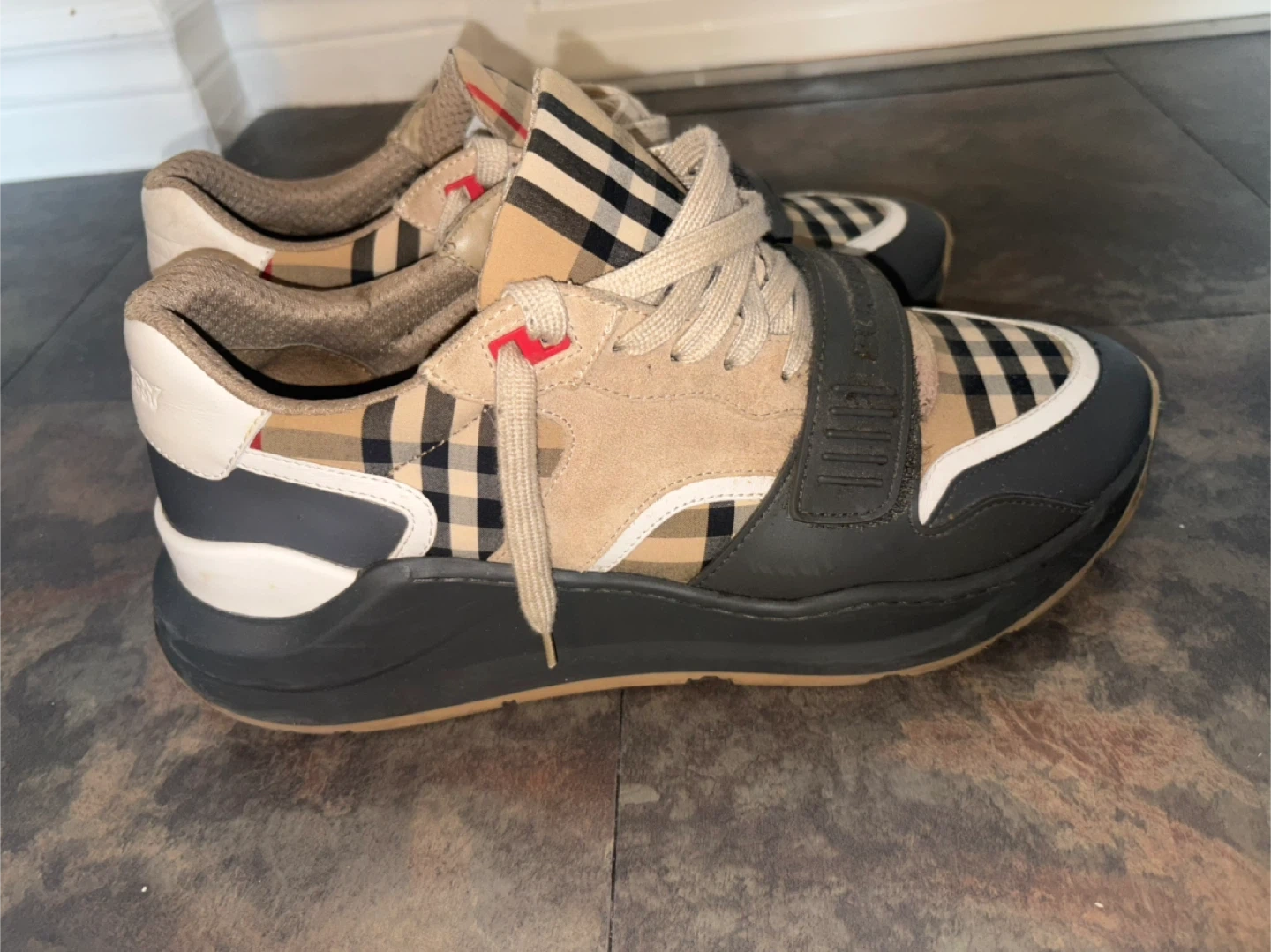 Selling a pair of Burberry sneakers, size 43. They feature the classic Burberry check pattern and are in good condition. A stylish addition to any wardrobe!