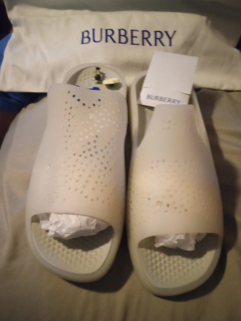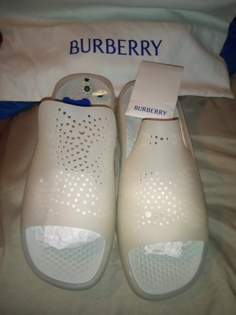 Selling a pair of Burberry slides in size 12 brand new never used They come with the original dust bag and the jibbitez. only interested people no games and back and forth messages. I'm asking $300