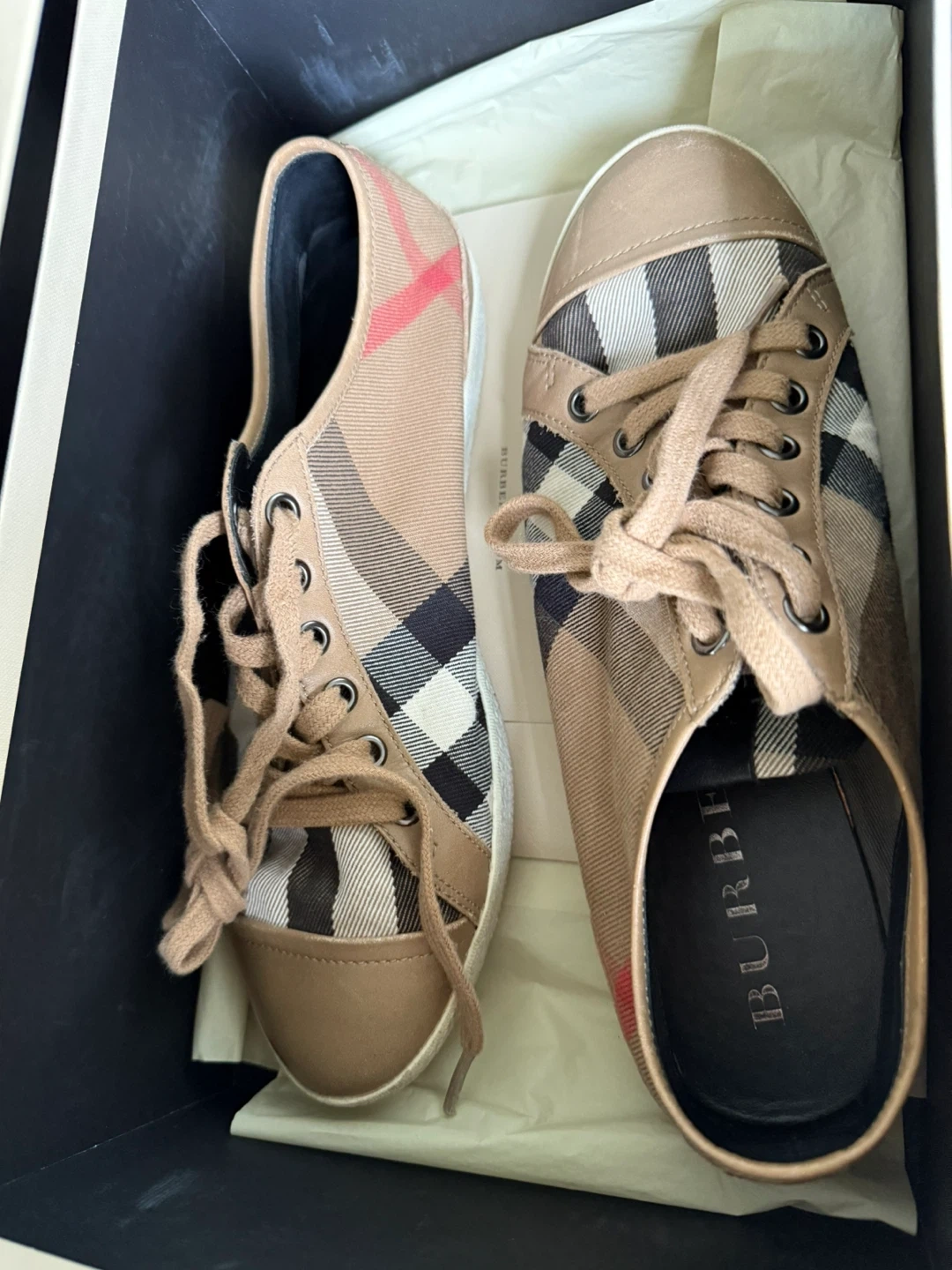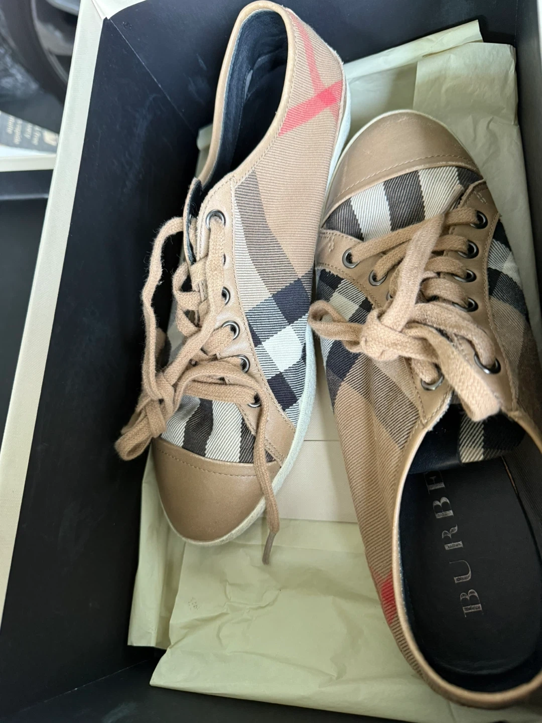 Selling a pair of Burberry sneakers in size 39. They come with the original box. These stylish sneakers feature the classic Burberry check pattern. Perfect for adding a touch of luxury to your casual outfits!