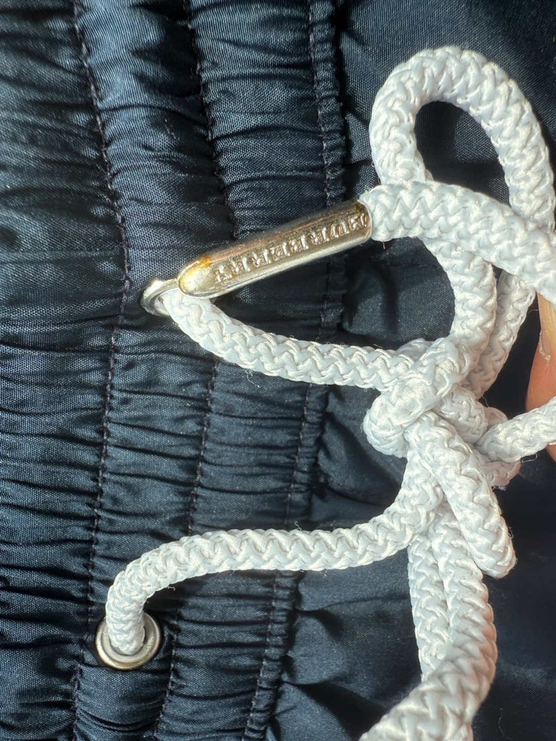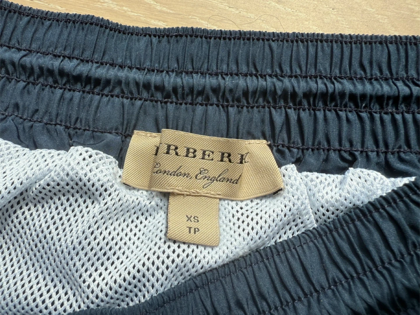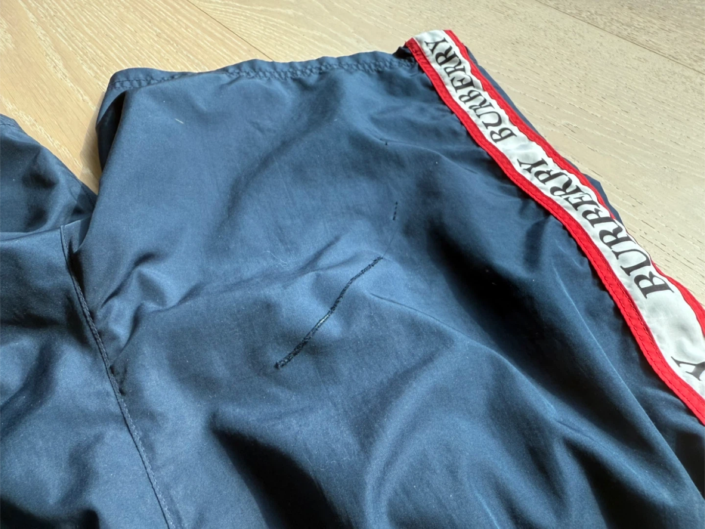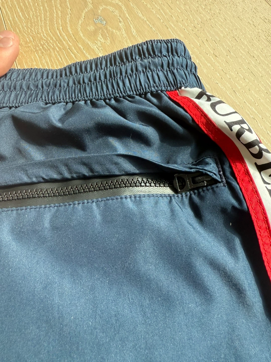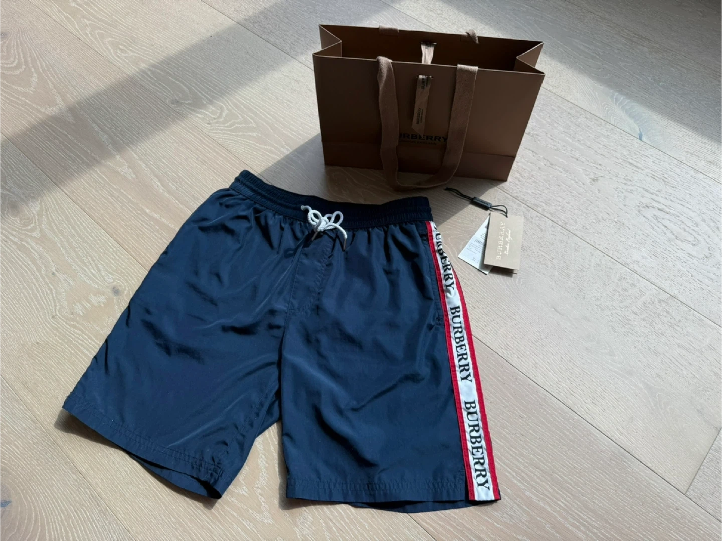 Burberry swim shorts in a navy blue colour. These shorts have the Burberry logo down the side. Comes with the original bag and tags and was bought at the flagship store in London England. Be aware that there is a rip in the back of the swim shorts and it is currently just held by tape that would not hold in water!