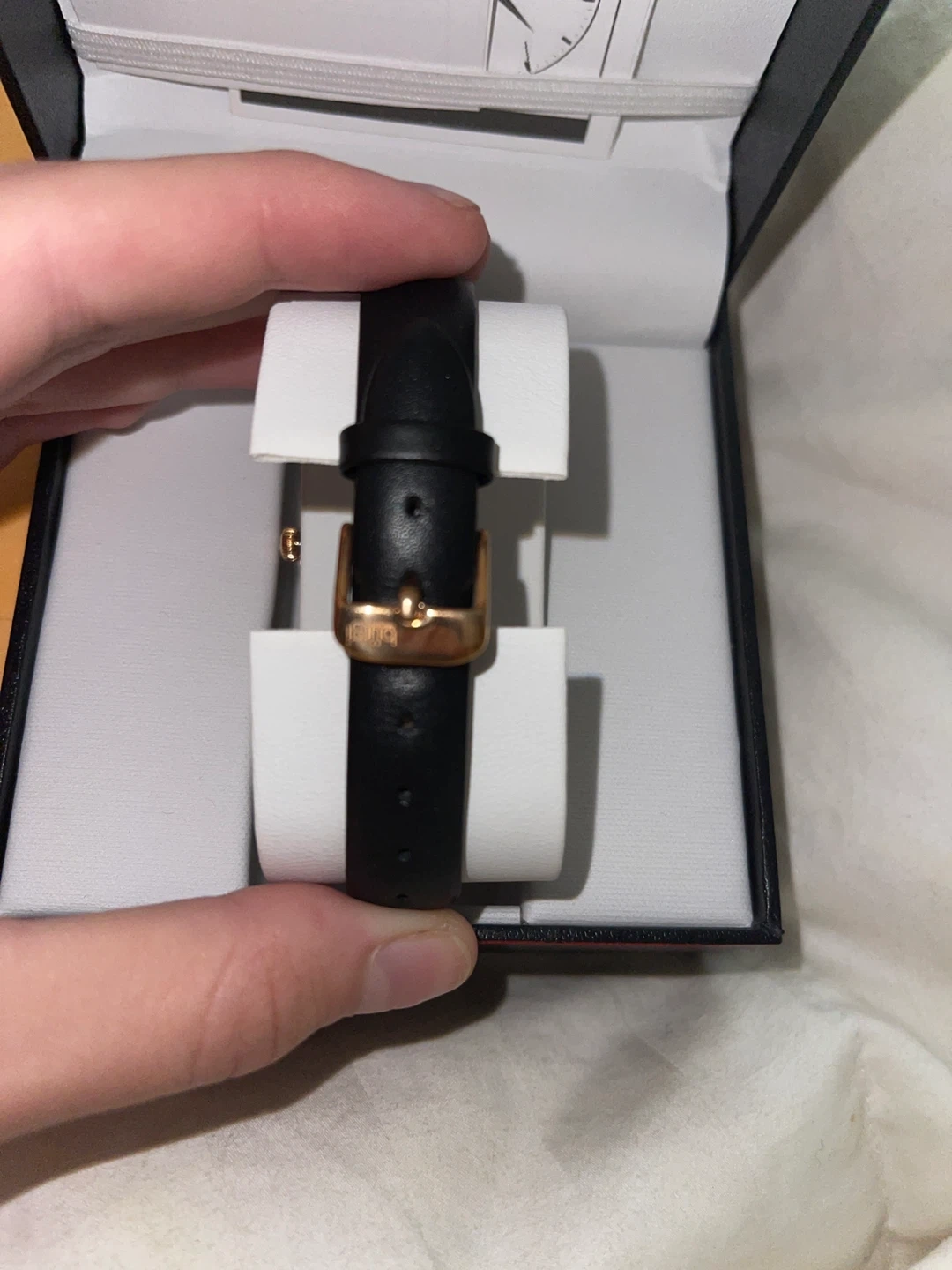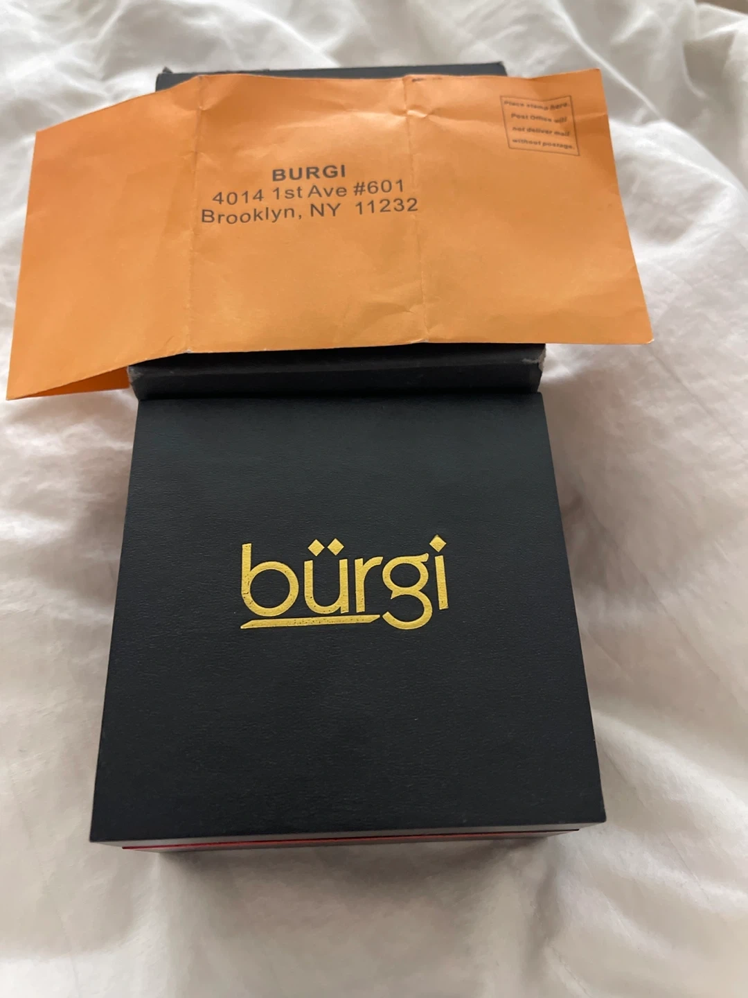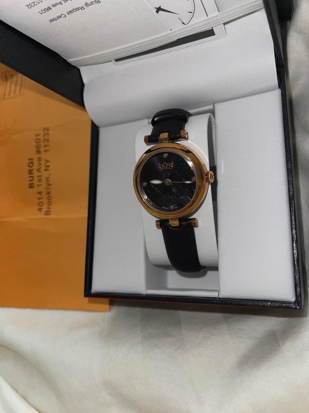 Selling a Burgi ladies watch with a black leather strap and gold accents. It comes in its original box. It's in great condition and ready for a new home! Never been used I got as a gift for Christmas but I’m not a watch person.