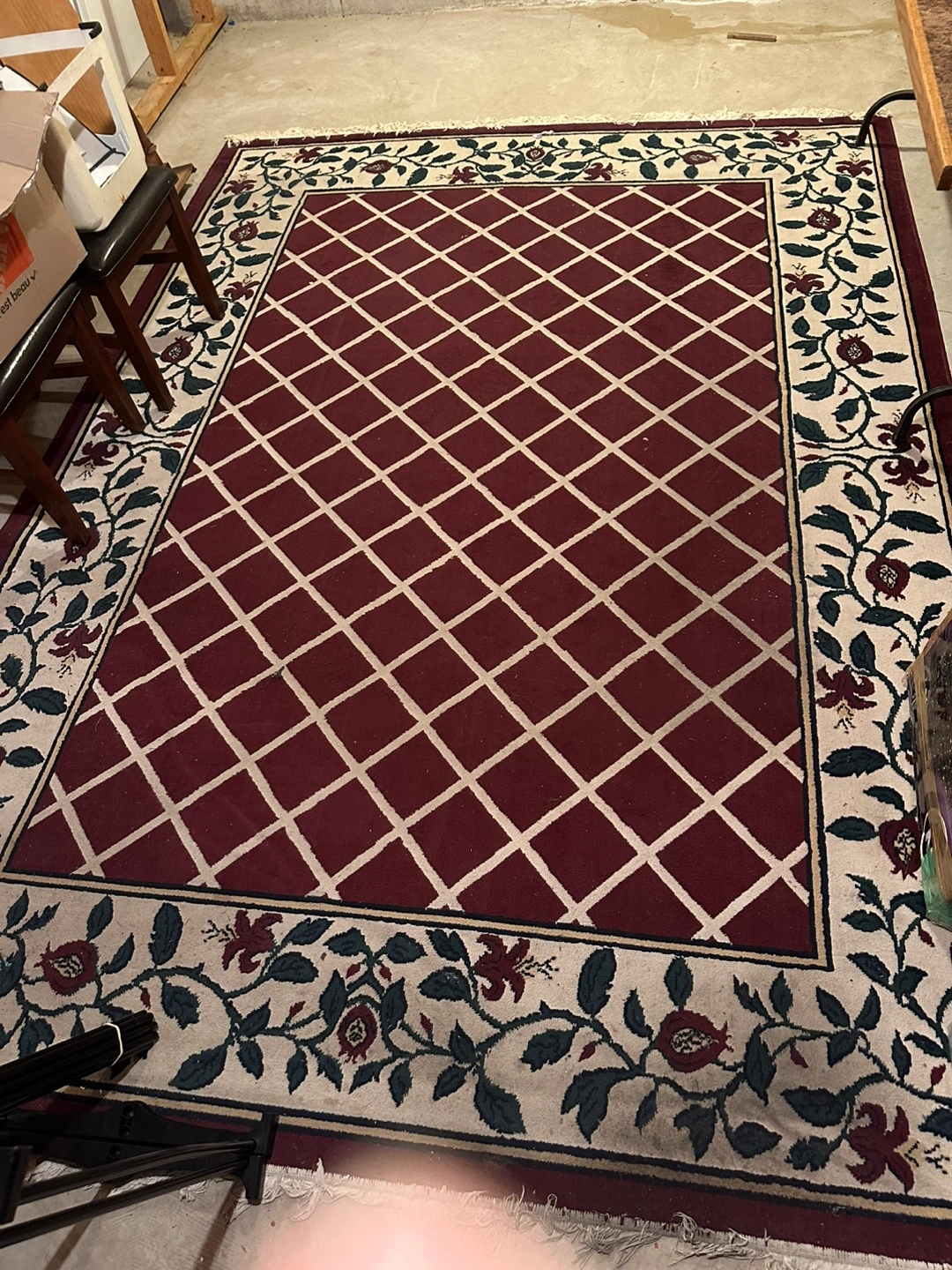 A beautiful area rug with a burgundy and cream colour scheme. It features a diamond pattern in the centre and a floral border. Perfect for adding a touch of elegance to any room!