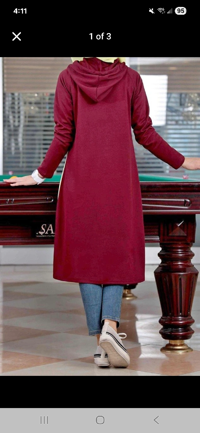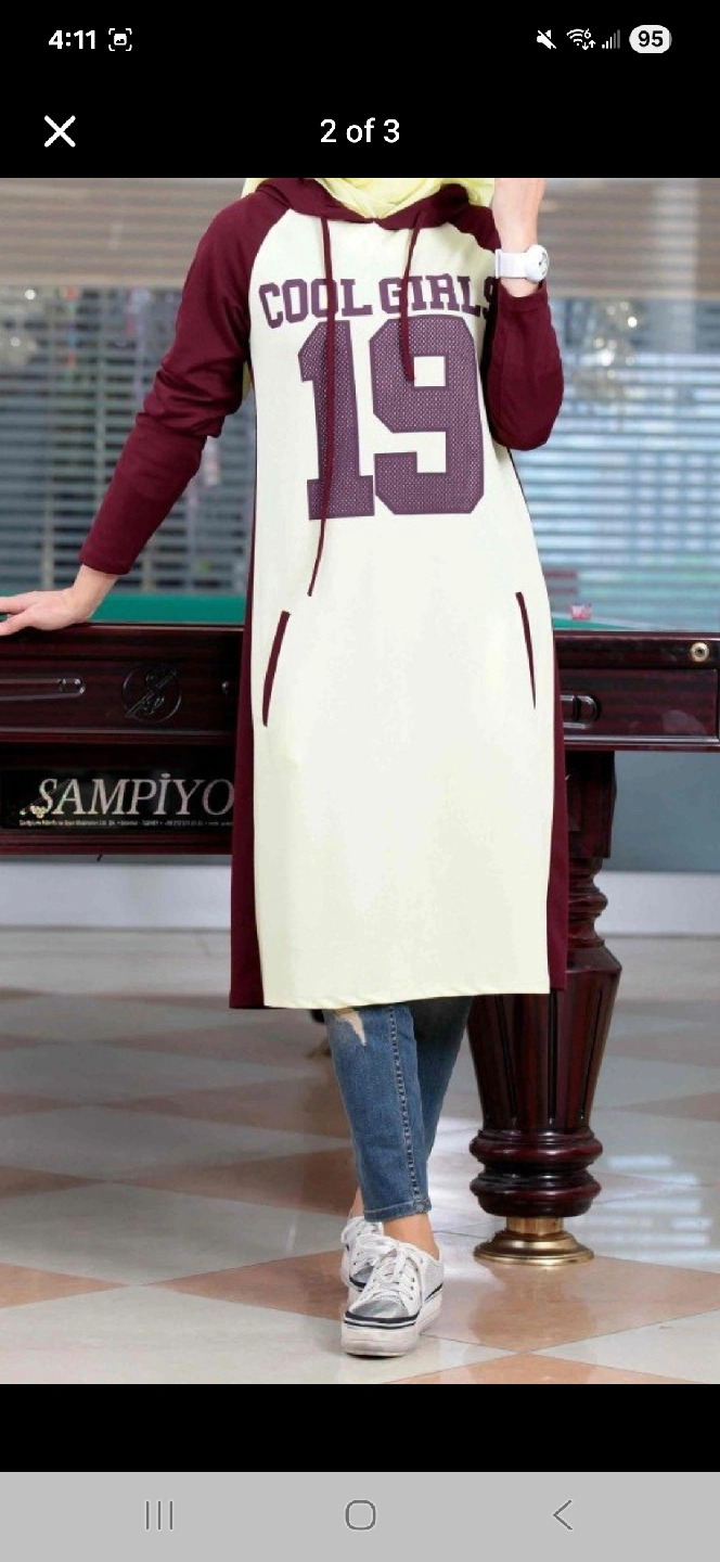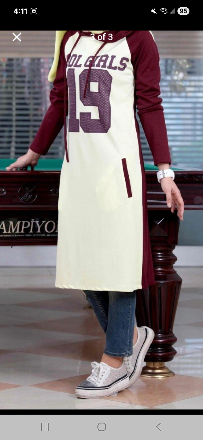 This hooded dress features a burgundy and cream colour scheme. It has long sleeves and a comfortable hood. Perfect for casual wear!