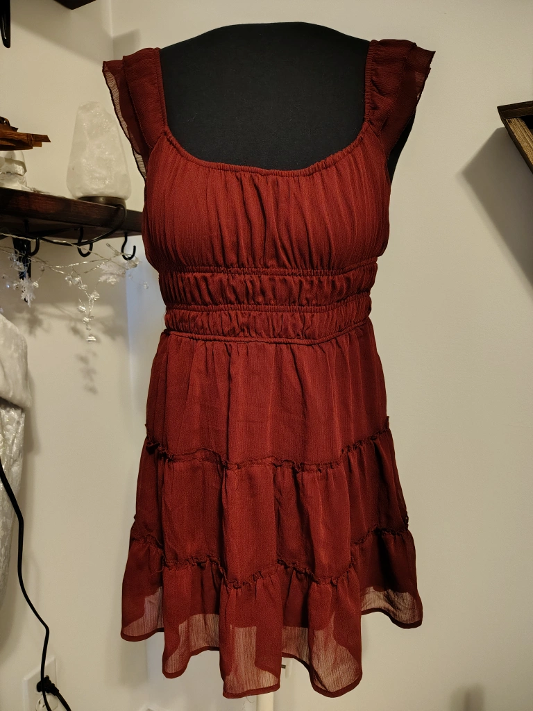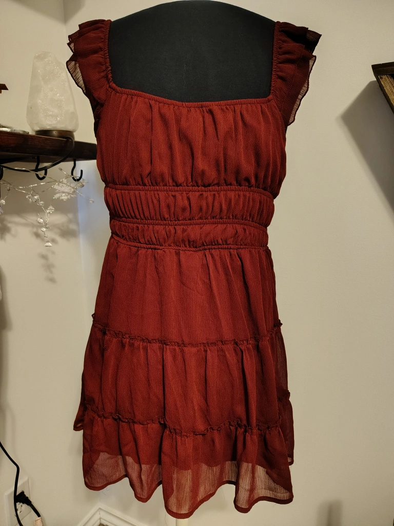 A cute burgundy dress, perfect for a casual day out or dressing up for a special occasion! It has a flattering square neckline and a tiered skirt. The material is lightweight and flowy, making it comfortable to wear. It's in great condition! theres a second layer as well on the skirt. ladies small but is very stretchy and could fit medium