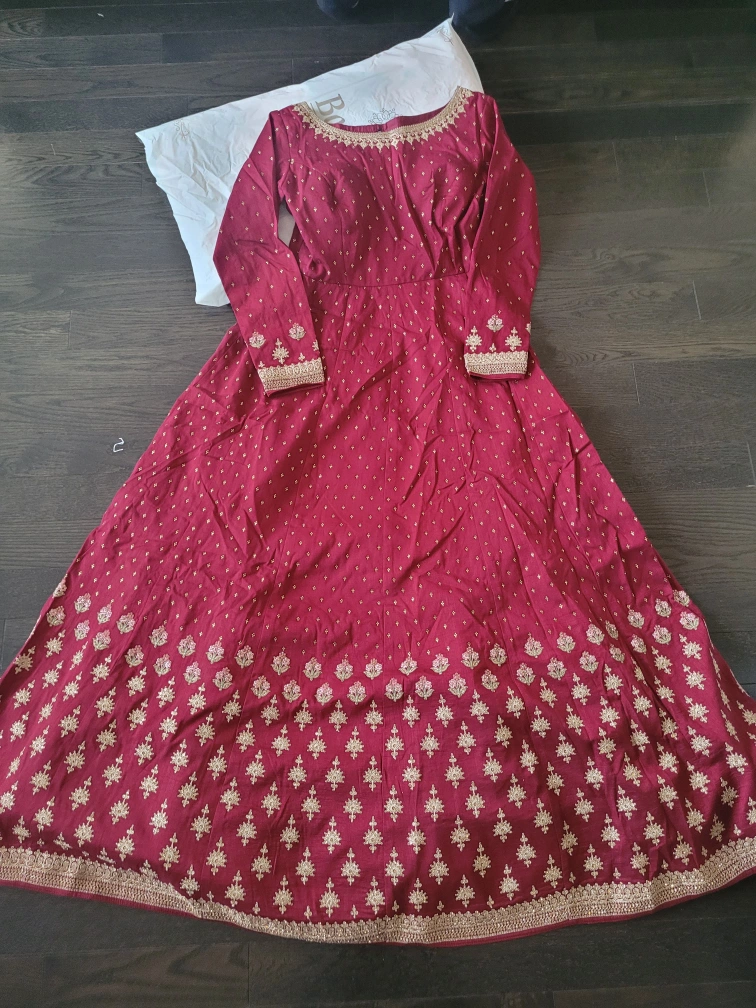 Beautiful burgundy Anarkali dress with gold embroidery. It's in great condition and ready for a new home. The dress features intricate detailing and a flowing silhouette, perfect for special occasions