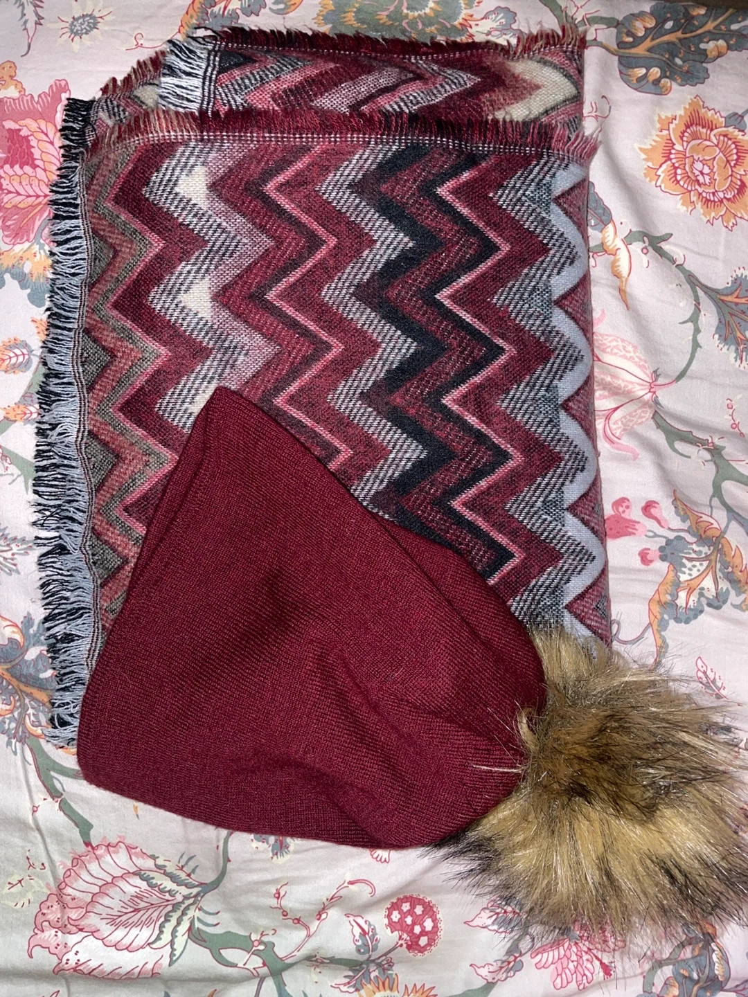 Selling a cozy burgundy knit hat, complete with a cute pom-pom! Also included is a stylish chevron patterned throw blanket. Perfect for staying warm and adding a touch of style to your home or wardrobe. The scarf is 100% viscose.