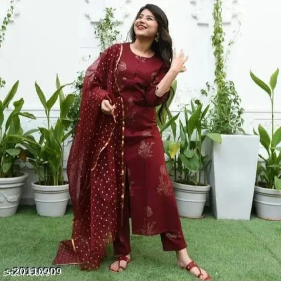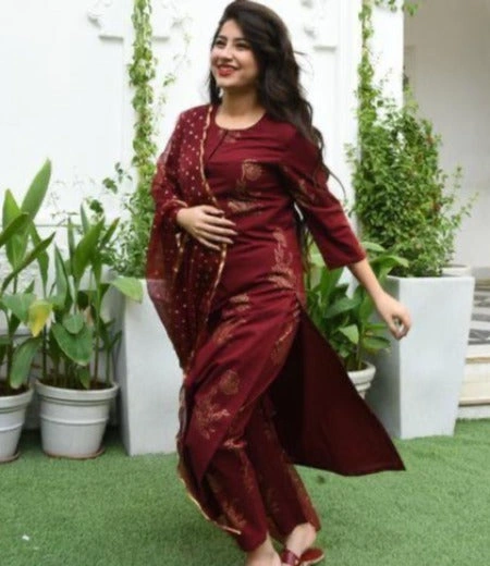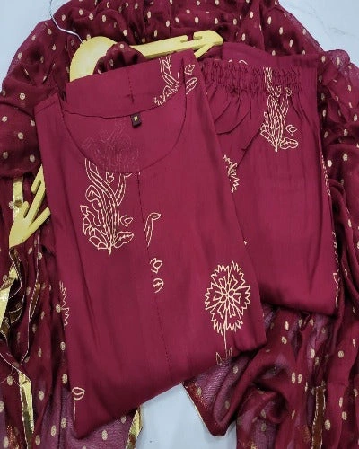 A beautiful burgundy kurti set, complete with a matching dupatta! The fabric feels lovely and soft, perfect for dressing up or down. The intricate gold detailing adds a touch of elegance, making it a standout piece in your wardrobe