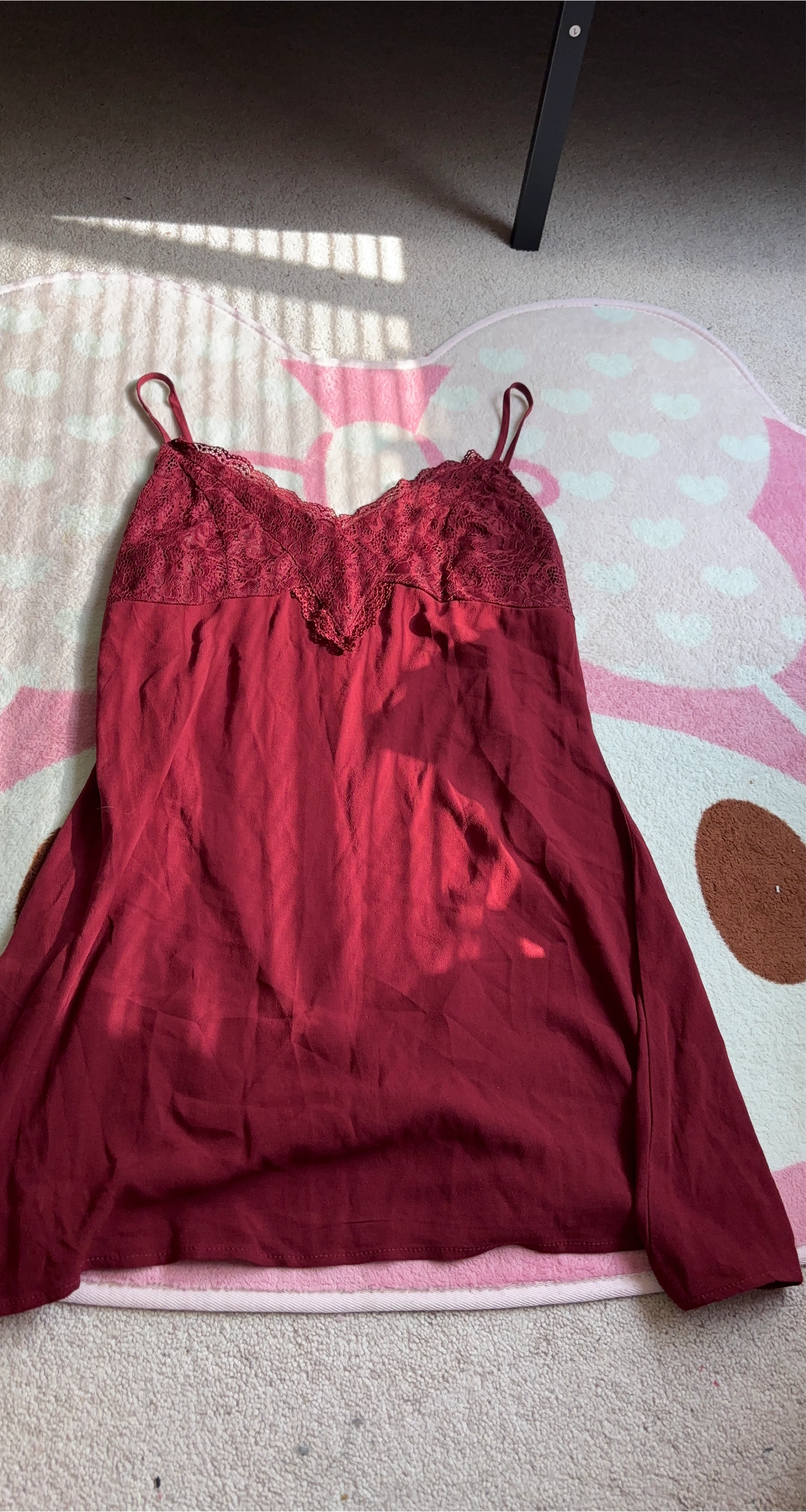 Here's a cute burgundy cami top with lace trim! It's perfect for layering or wearing on its own. The colour is a deep, rich burgundy, and the lace adds a touch of elegance. It's in great condition and ready for a new home! I wore it once for a part because I was forced to and never wore it again, it’s been used once