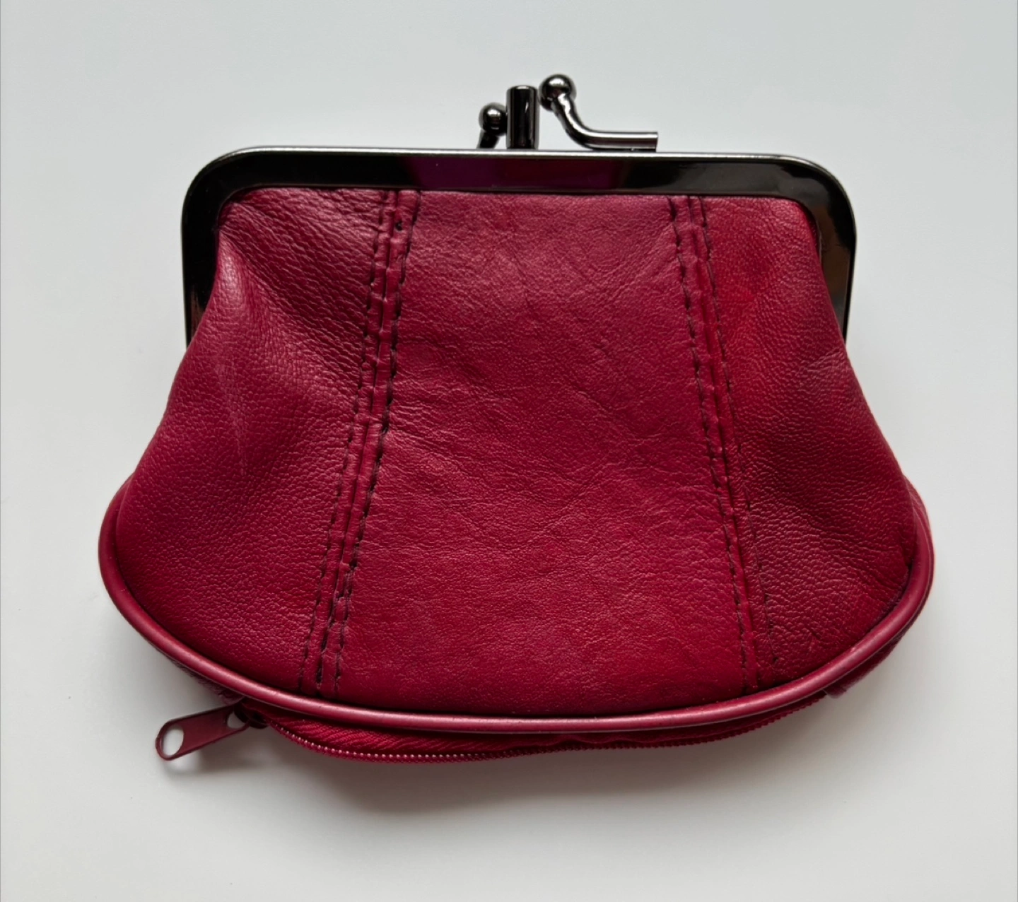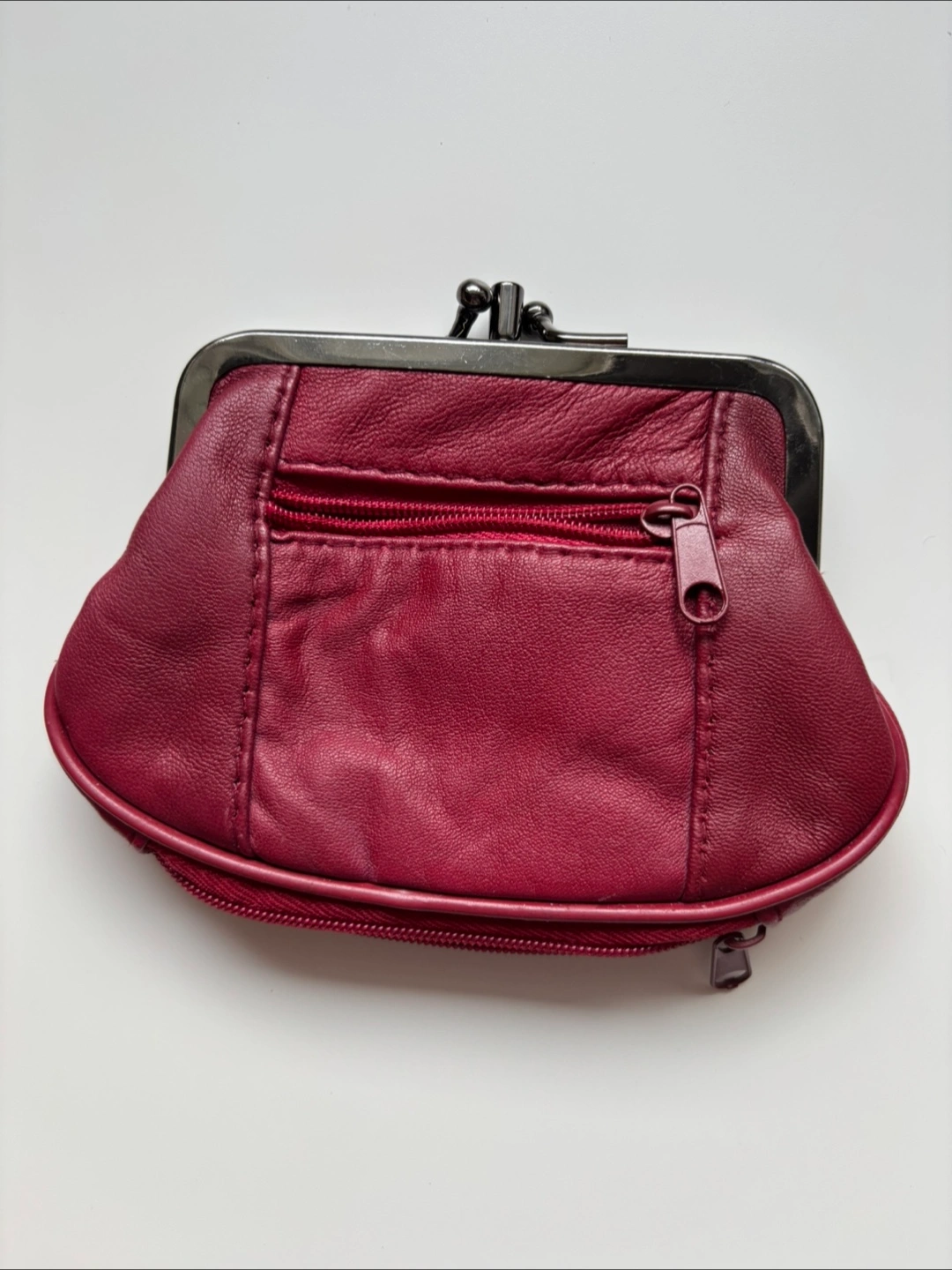A cute burgundy leather coin purse with a kiss lock closure and a zippered compartment on the back. It's perfect for keeping your change organized and easily accessible! The inside is a matching red colour