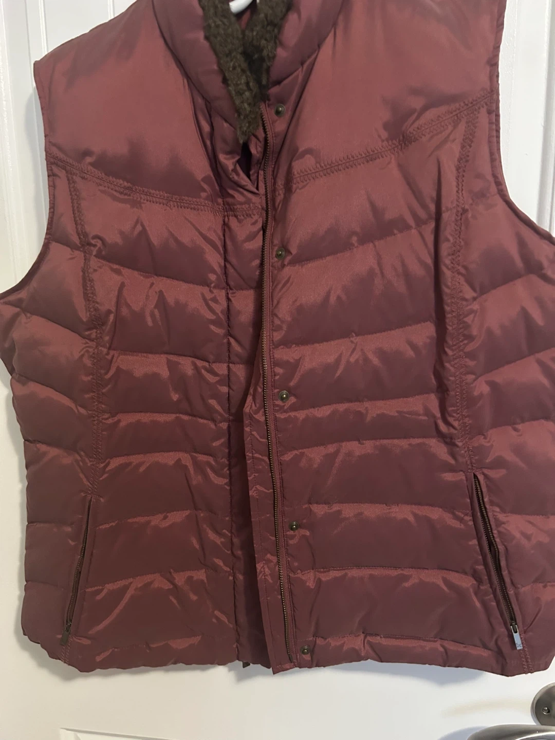 Here's a cozy burgundy puffer vest that's perfect for layering! It features a soft faux fur trim around the collar for extra warmth and style. There are also handy zippered pockets on the front. Great for adding a bit of extra warmth on chilly days!