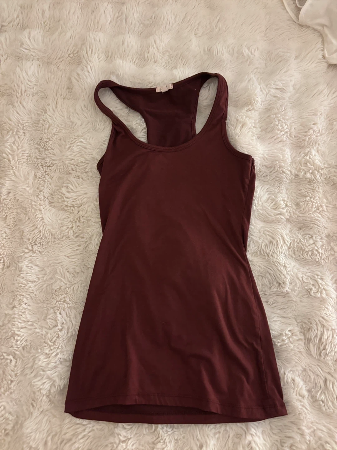 A burgundy racerback tank top, perfect for workouts or casual wear. It's in great condition and ready for a new home!