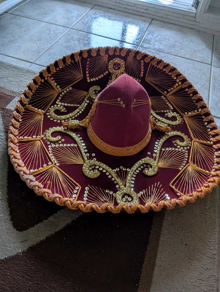 Selling a burgundy sombrero! It has beautiful gold detailing and is in good condition. Perfect for adding a festive touch to any occasion