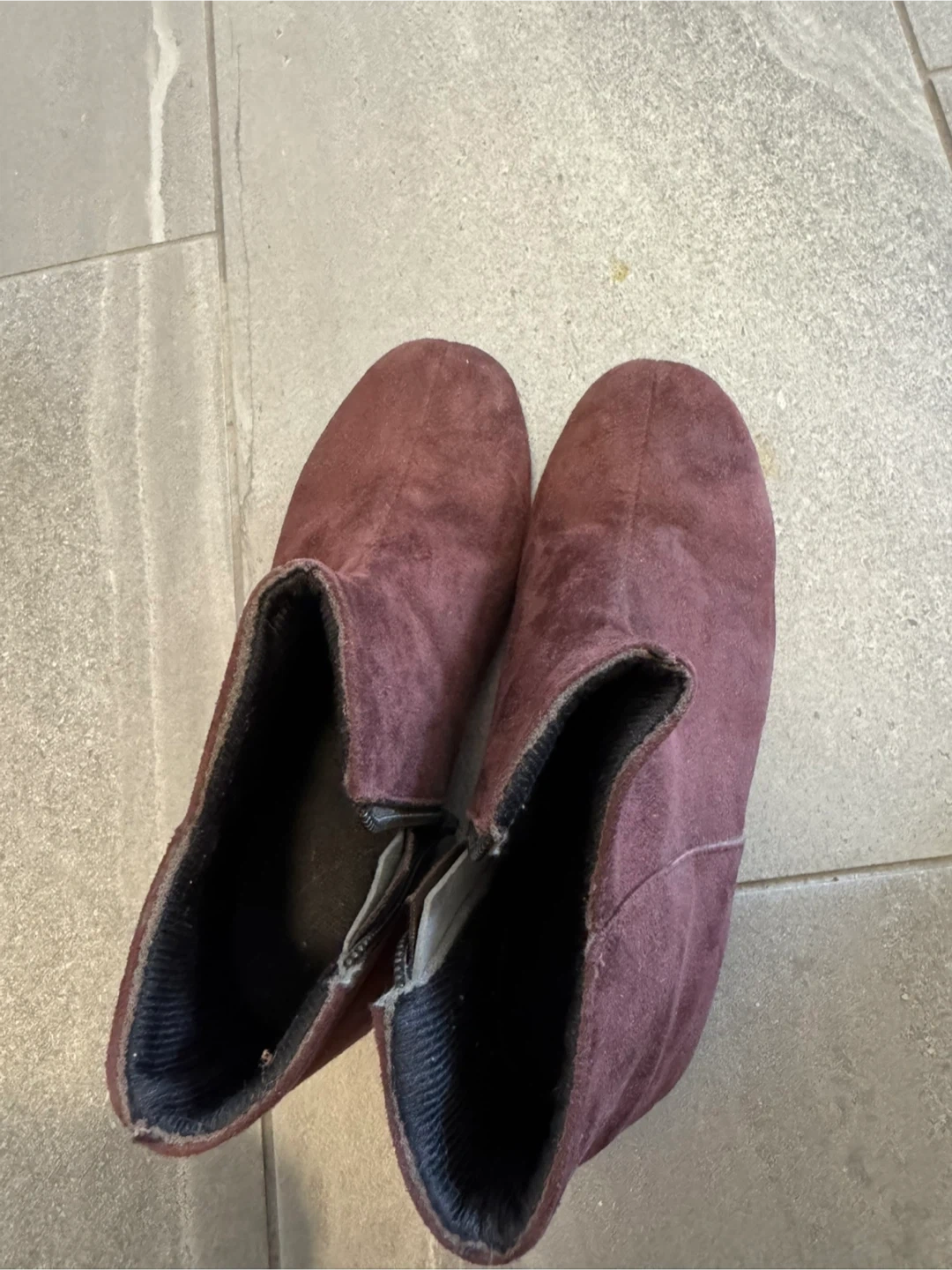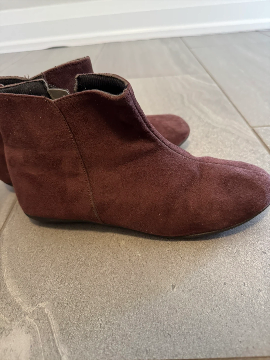 These are a pair of burgundy suede ankle boots! They feature a comfortable, stylish design perfect for everyday wear. The suede material gives them a soft, luxurious feel. They are in good condition. My daughter wore them till she turned 10 years old.