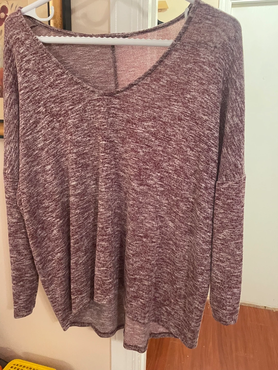 Selling a comfortable burgundy and white long-sleeved top! It's a V-neck style and perfect for layering or wearing on its own. The material is soft and cozy, great for cooler weather. It's in good condition and ready for a new home