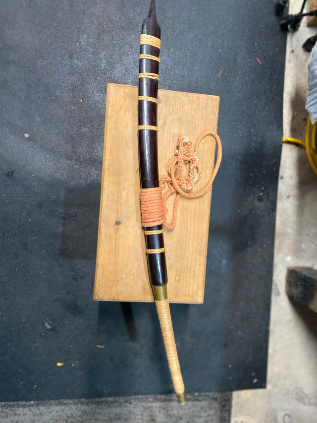 The image shows a Burmese Dha sword with a wooden scabbard. Here is some helpful information: The Dha is a general term for knives and swords used across Southeast Asia, especially in Myanmar, Thailand, and surrounding regions. It functions as both a tool and a weapon. The scabbard is often made of wood and may feature decorative elements. Dhas vary in size and shape, reflecting the diverse cultures that use them. Collectors value authentic Dhas, looking for quality craftsmanship and signs of age. The Dha is still used today as a machete and weapon lots of unique markings on the sword 34”