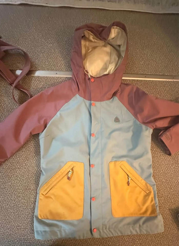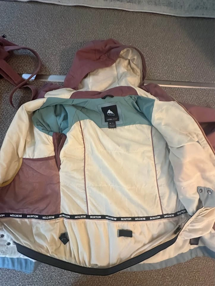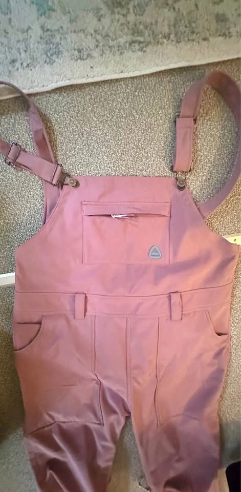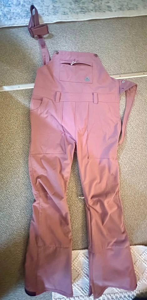 Women east fall Burton Jacket (Women’s medium) Rose brown/ Trellis/ Harvest Gold in colour - Winter Jacket - Premium waterproofing of DRYRIDE two layer fabric., quick drying - Thermolite insulation (low bulk, mild conditions) - Synthetic fill - Sleeve vents, removable waist gaiter - Pockets for phones, goggles etc. - Regular fit - Adjustable cuffs and hood is helmet compatible with rear adjustment Avalon Bib Pants (women’s large) -2 layer shell is waterproof, breathable and quick dry -stretch back panel, zippered drop seat, thigh vents, adjustable suspenders - Lots of pockets (chest, zippered micro fleece hand warmer pockets)