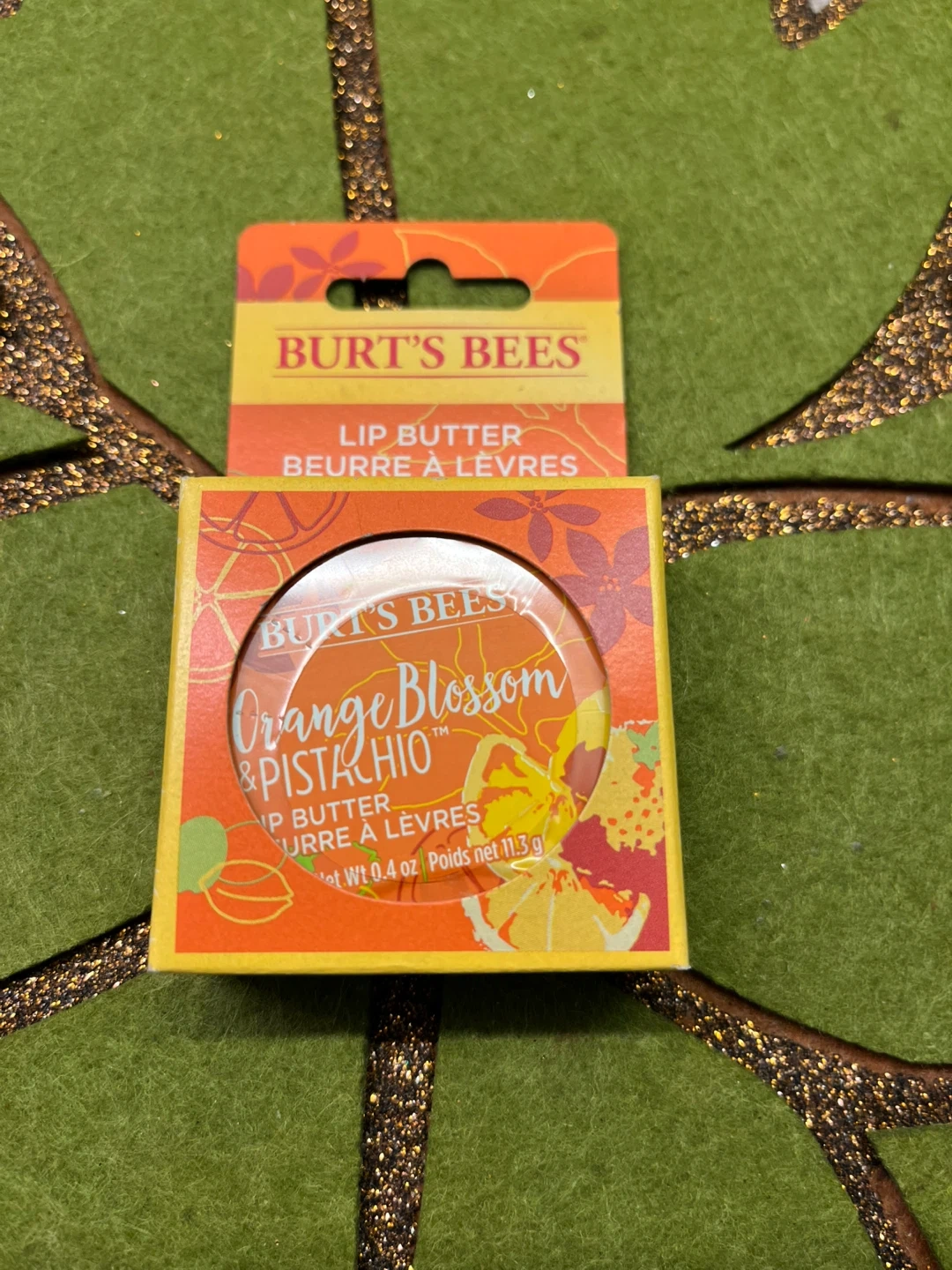 Selling a Burt's Bees lip butter in the Orange Blossom & Pistachio scent. It's brand new and has a net weight of 11.3g/0.4 oz