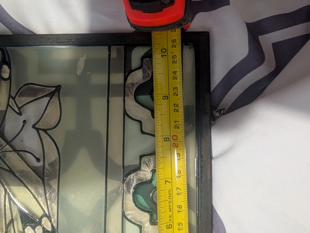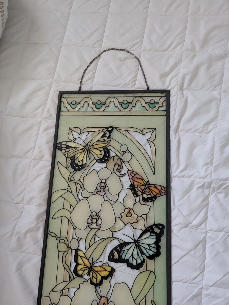 Selling a lovely stained glass panel featuring a butterfly and floral design. It measures approximately 36 inches in length and 10 inches in width. It's in great condition and would add a touch of elegance to any room!