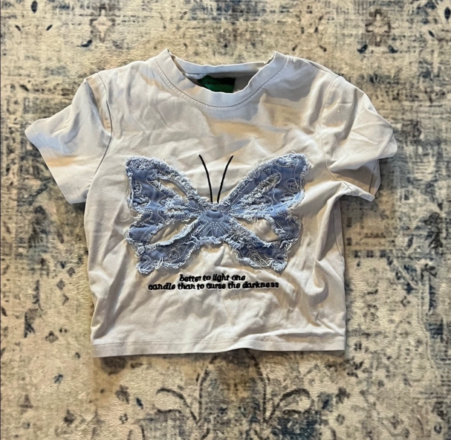 Cute t-shirt with a butterfly graphic. The shirt is light in colour and has a quote that says "Better to light one candle than to curse the darkness". It's in great condition!