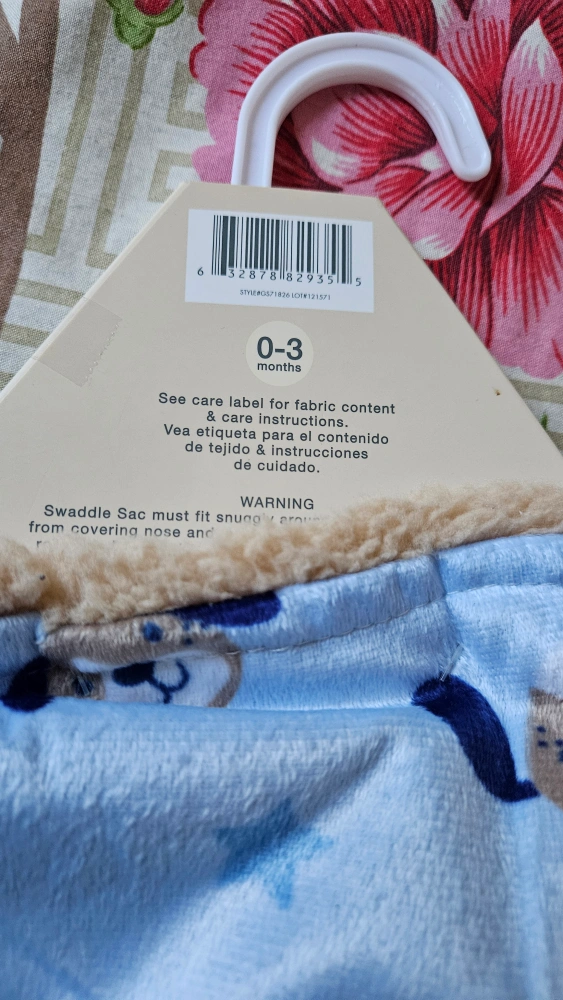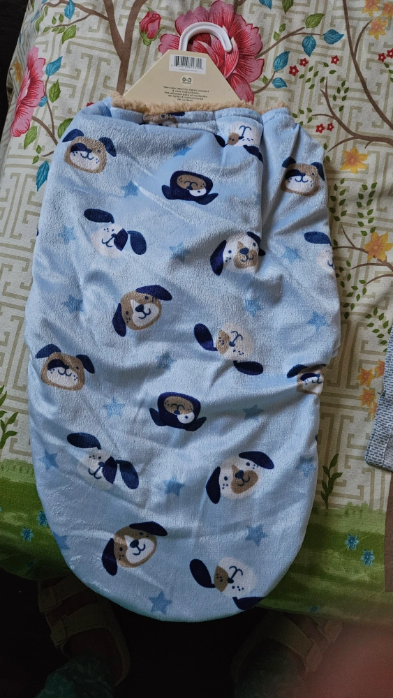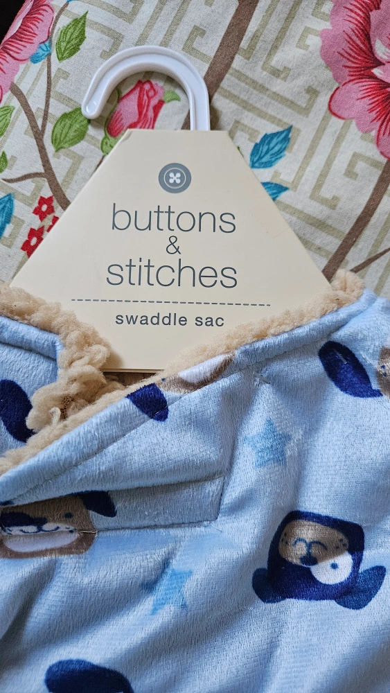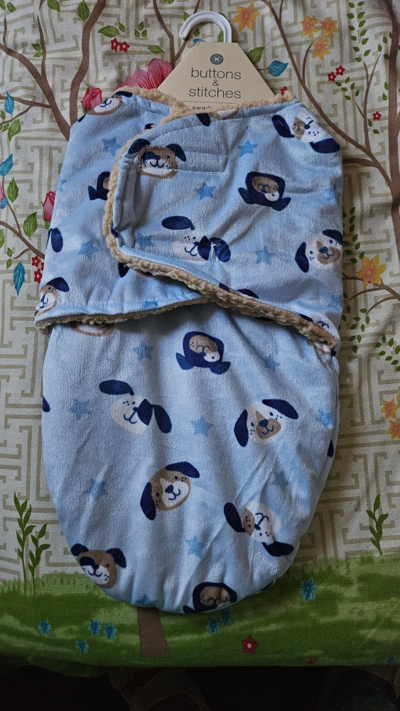 This Buttons & Stitches swaddle sac is perfect for keeping your little one snug and secure! It's designed for babies aged 0-3 months and features a cute dog print on a soft, light blue fabric
