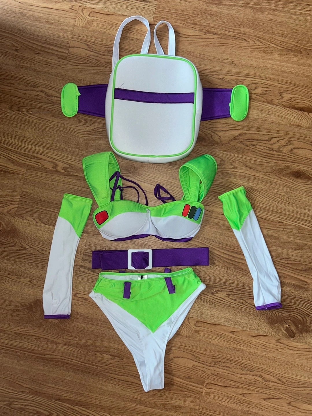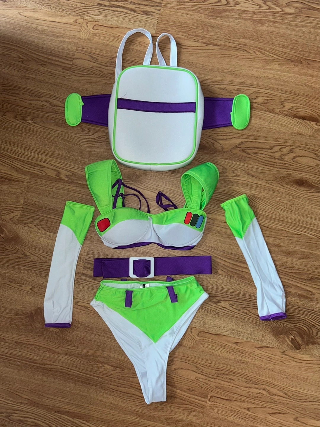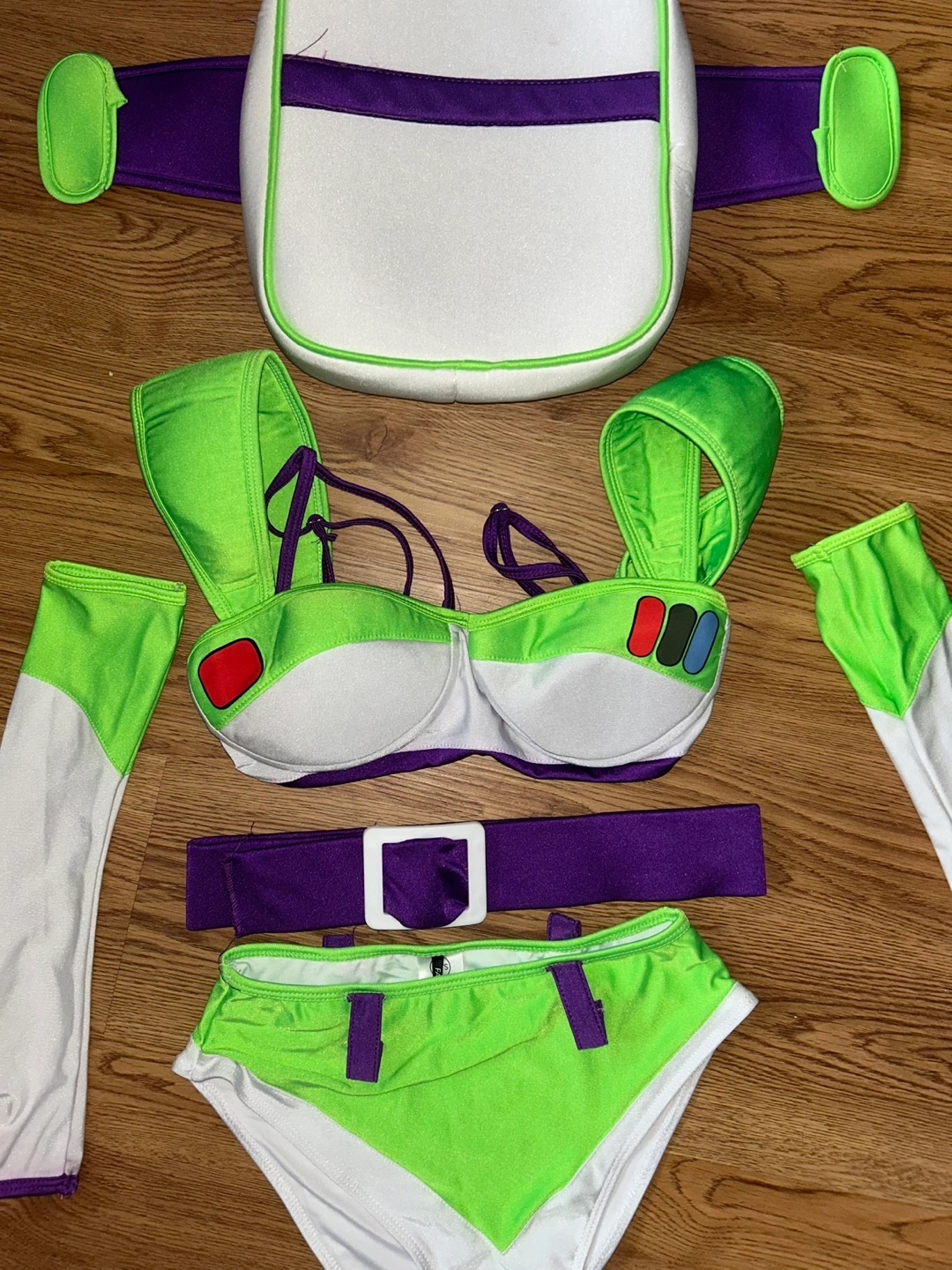 Costume includes a bra, belt, bottoms, sleeves, and a backpack. Great for a costume party. Only used once for Halloween. Undergarment was never used because I used a skirt.