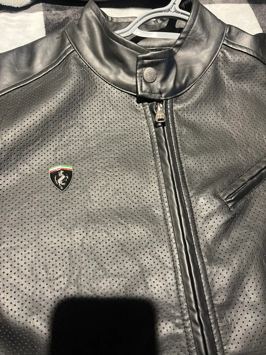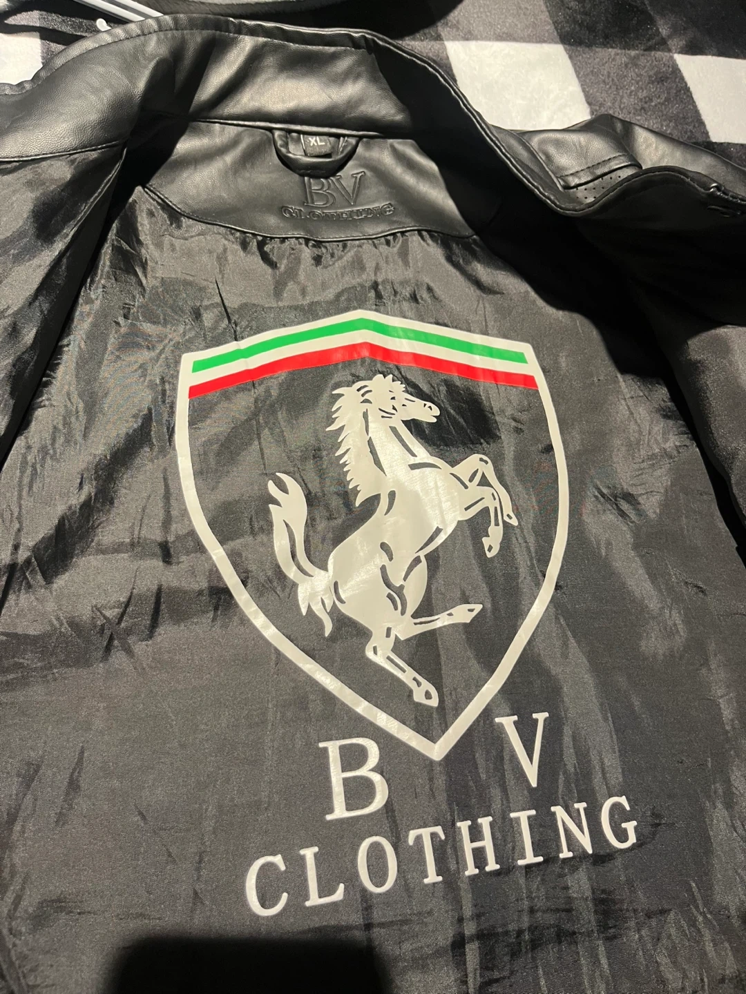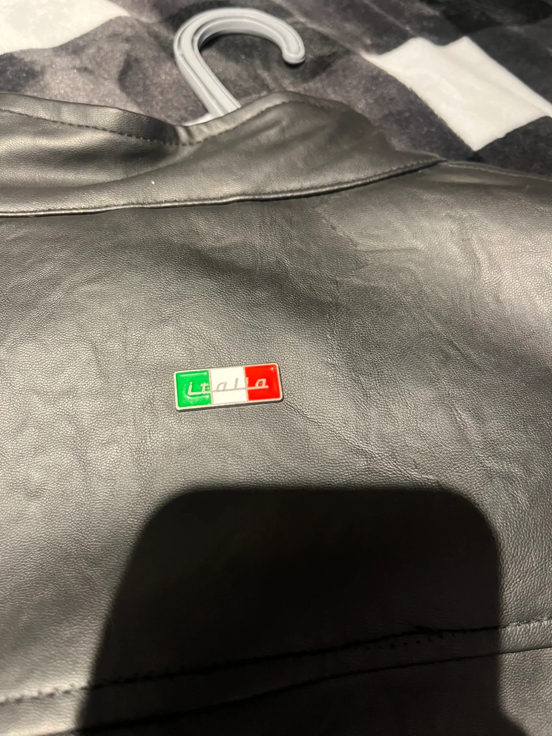 Selling a gently used BV Clothing black leather jacket in size XL. It features a unique perforated design and an Italian flag detail.