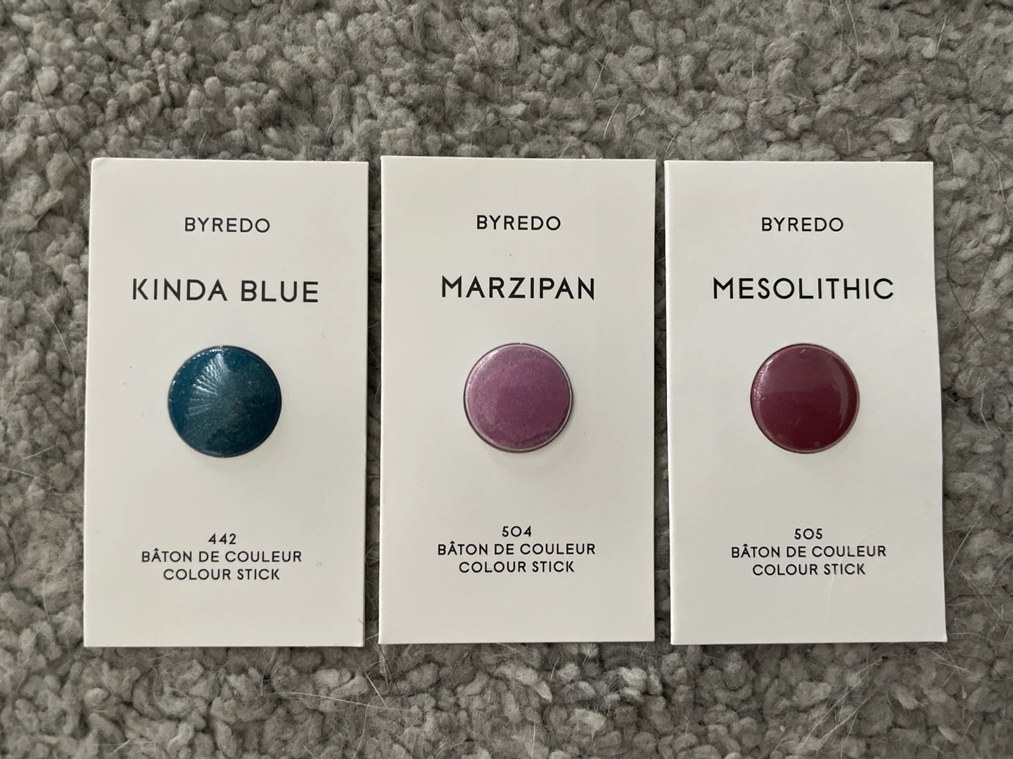 Set of three Byredo colour sticks, "Kinda Blue", "Marzipan", and "Mesolithic".