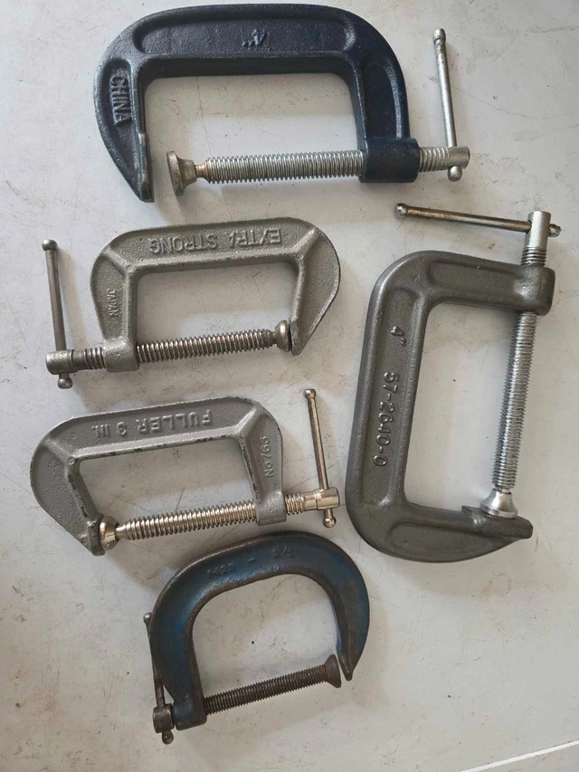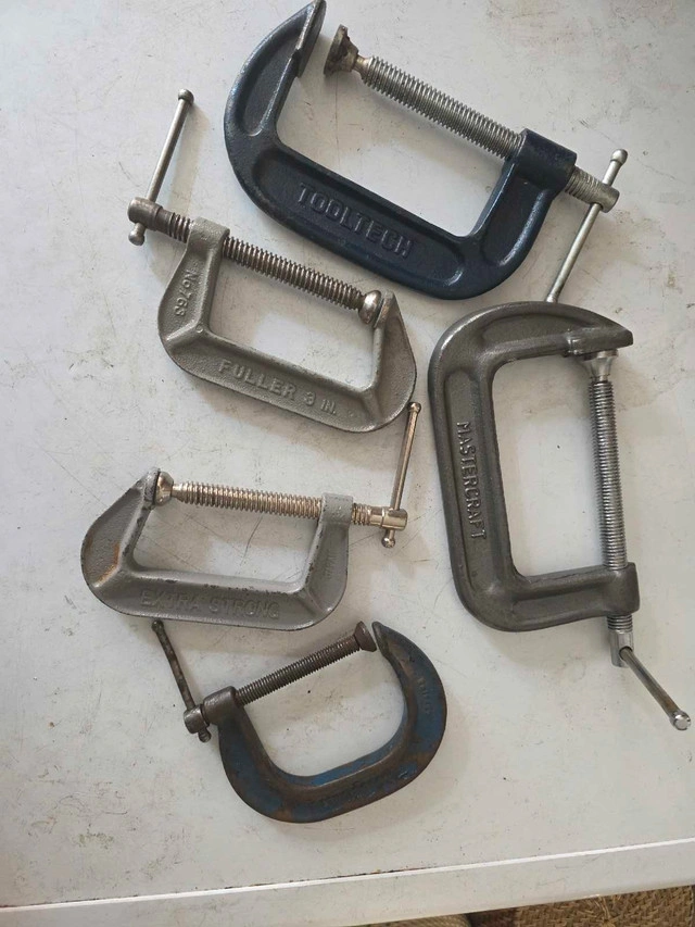 These "C" clamps are perfect for any job, featuring various sizes to suit different needs. They have been previously used and show signs of wear, but are still in good working condition and ready for your next project. Here are the specifications: * Sizes: Range from 2 1/2 to 4 inches * Brands: Tooltech, Fuller, Mastercraft and more * Material: Metal If the ad's still up, these clamps are available.