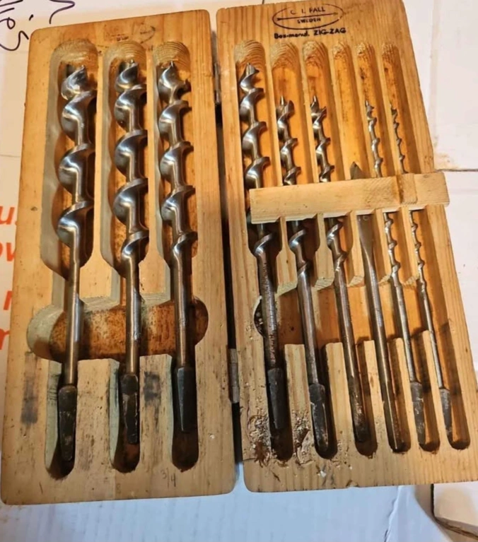 Selling a vintage C.I. Fall Sweden Auger Drill Bit Set in a wooden box. The box is marked "No 31A" and has a distinctive oval logo indicating its Swedish origin. A great find for collectors or those who appreciate quality vintage tools VINTAGE SET OF SWEDEN AUGER DRILL BITS SET Wood BOX asking 180.00, meet in Abbotsford