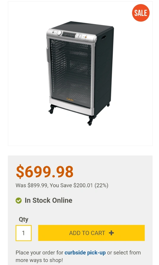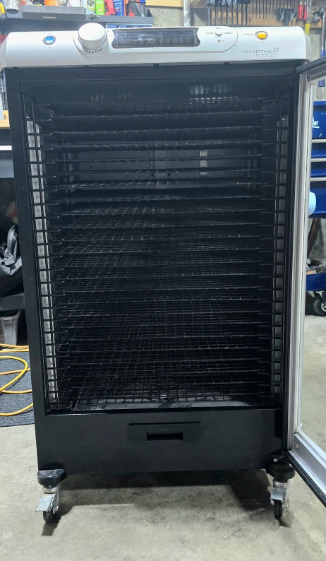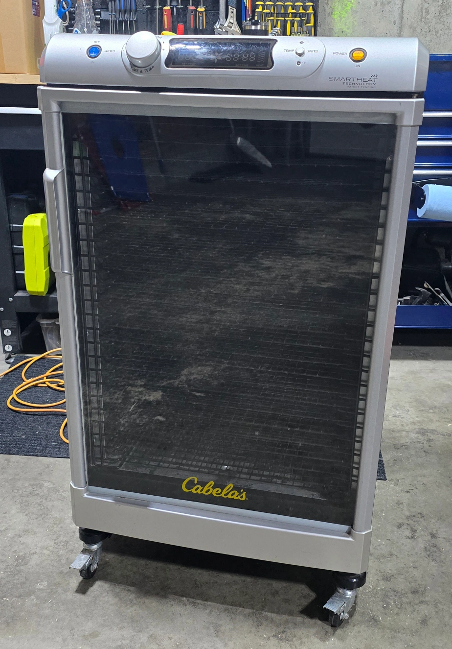 160L Cabela's Commercial-Grade Food Dehydrator I am just not using and is taking up space. Works perfectly, heats up fast. both F and C temperature readout. Some very minor scratches on the side from moving. Details from the Cabelas site: Penta 360-Degree Air flo for even air circulation • Smart Heat monitors air intake and internal temperature • Powerful 1,600-watt heater • Easy-to-read, four-colour display with one-button control • 24 high-intensity LEDs allow you to see inside • Includes 24 removable racks Drain reservoir with removable drawer to catch drippings for easy cleanup. Locking caster wheels. Carry handles. Includes 24 removable 18-3/4”L x 15-3/4”W (47.6 cm x 40 cm) racks. Dimensions: 23”L x 19.875”W x 39-1/2”H (58.4 cm x 50.4 cm x 100.3 cm) Weight: 110 lb. (49.8 kg) CASH ONLY ON PICKUP