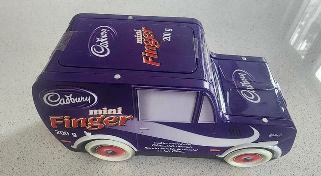 This Cadbury Mini Fingers truck-shaped tin is a delightful collectible! While it's a used item, it's in good condition, making it a charming decorative piece or a nostalgic throwback. Perfect for adding a touch of whimsy to any space. I estimate it's worth around $20 based on similar collectible tins I've seen listed on Kijiji. If the ad is up, it's available!