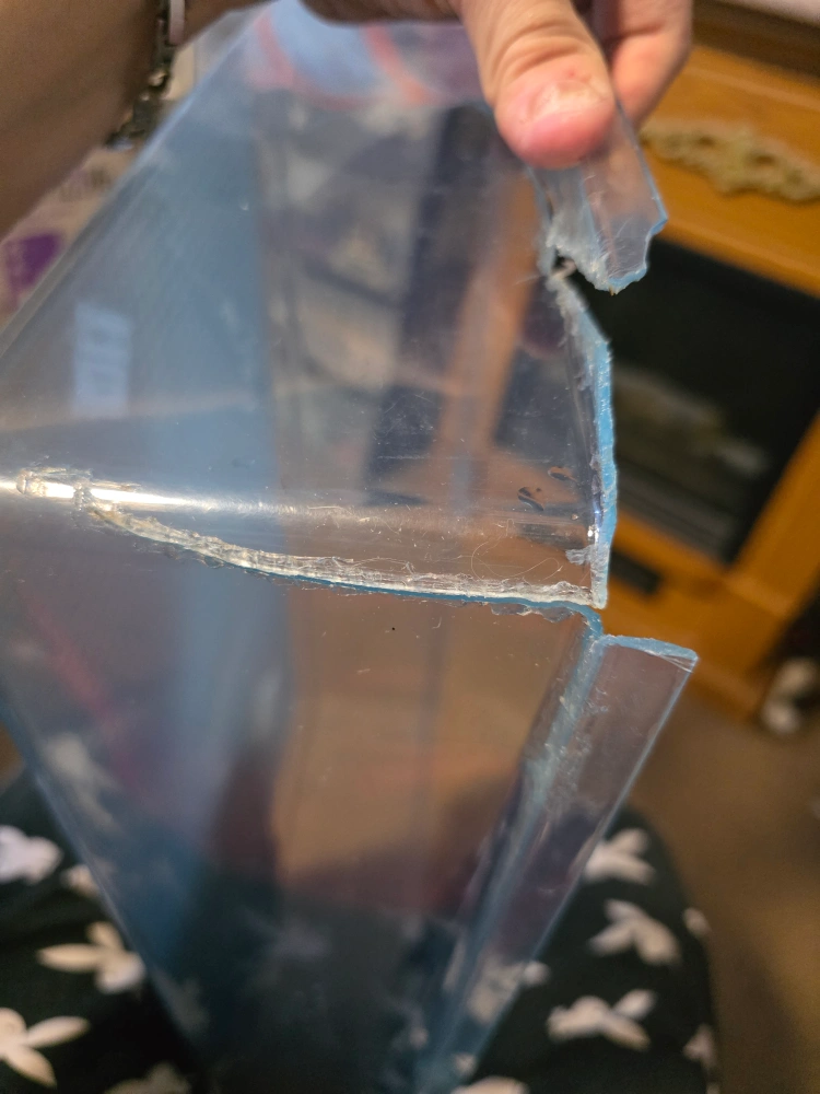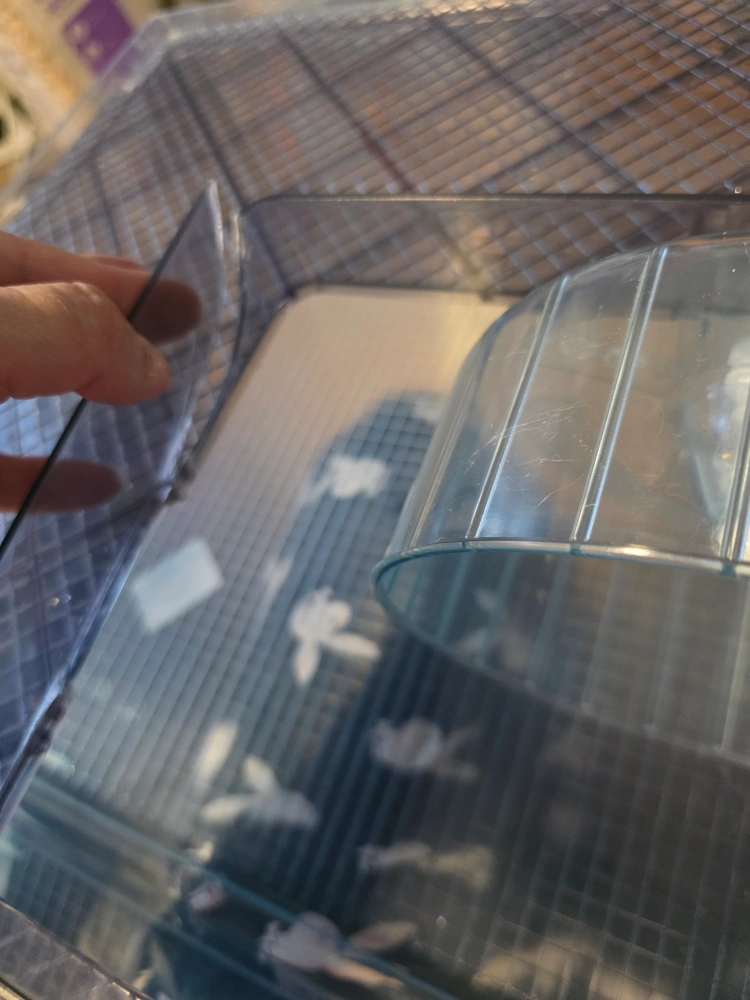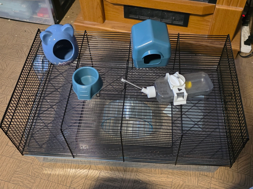 Selling a used cage that comes with accessories. The cage includes a water bottle, food dish, and a house. The bottom tray is cracked in corner, anyone who can solder can easily melt the plastic together to put it back intact, I was sold it this way. Price is reflected to cage issues. Images show the cracks.